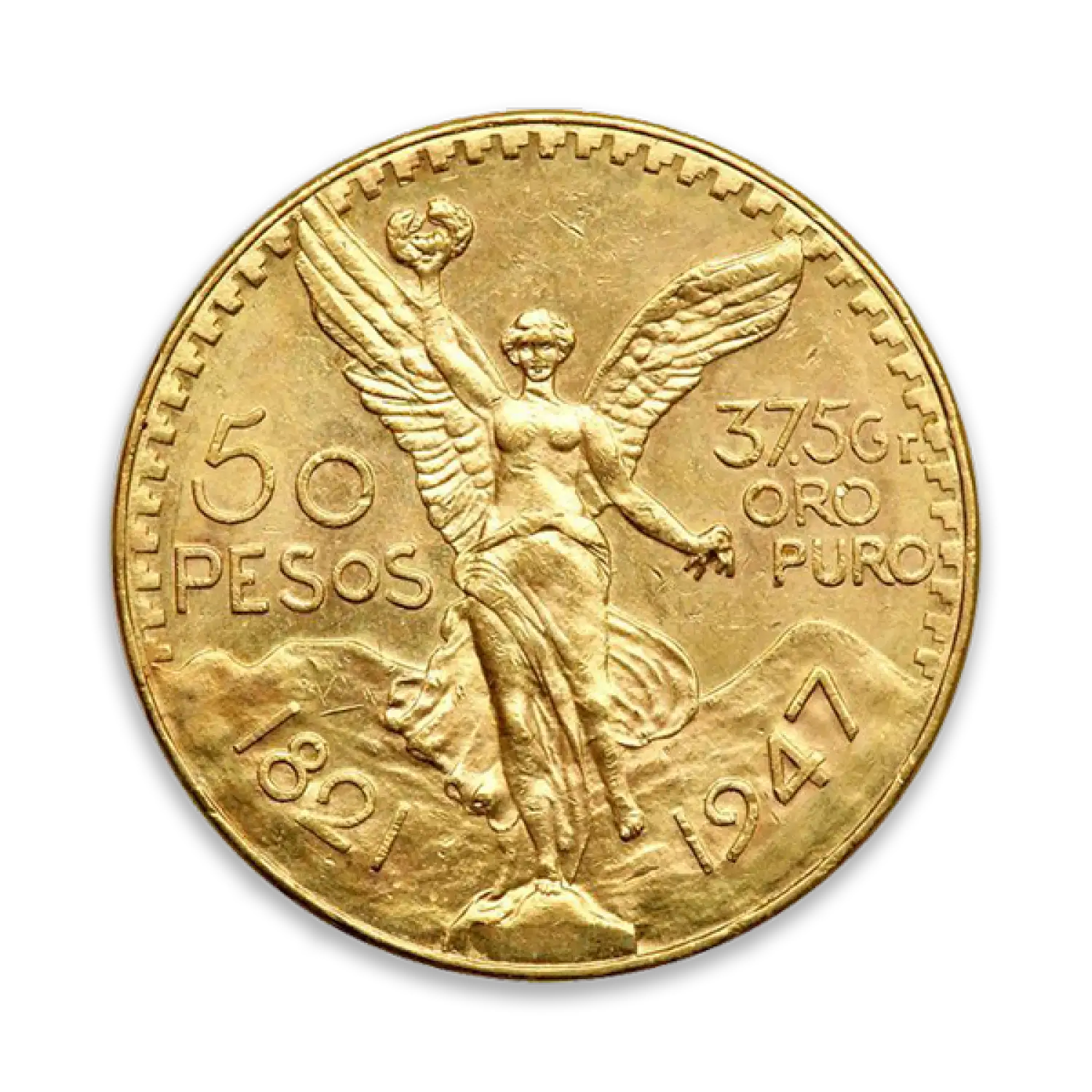 The obverse of the Mexican 50 Pesos Gold Coin features the image of Winged Victory, with a laurel wreath in her right hand and broken chains in her left.