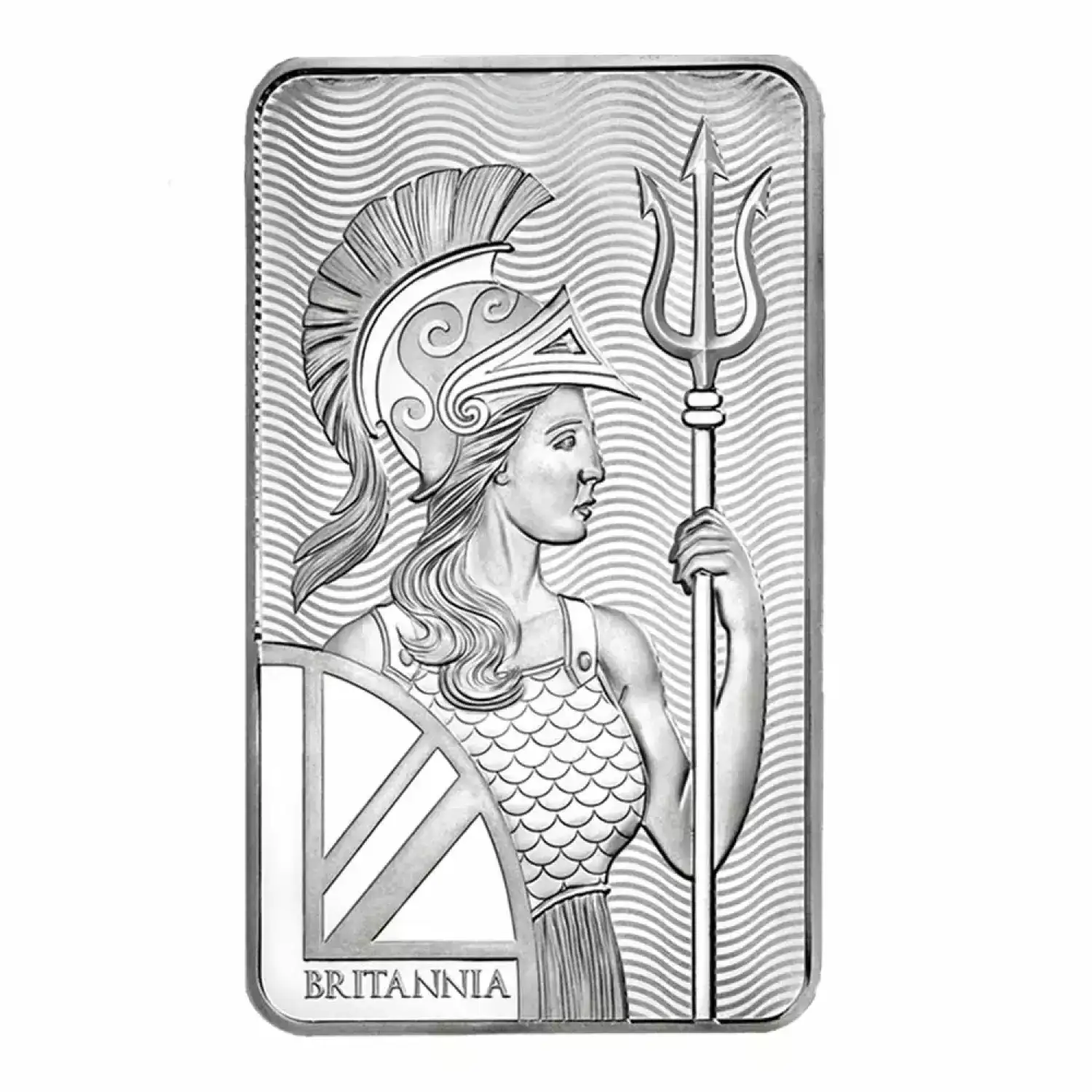 · The reverse features the Royal Mint logo along with the bar’s metal content, fineness and weight. The obverse features lady Britannia as a warrior, wearing a helmet and a trident in her left hand.
