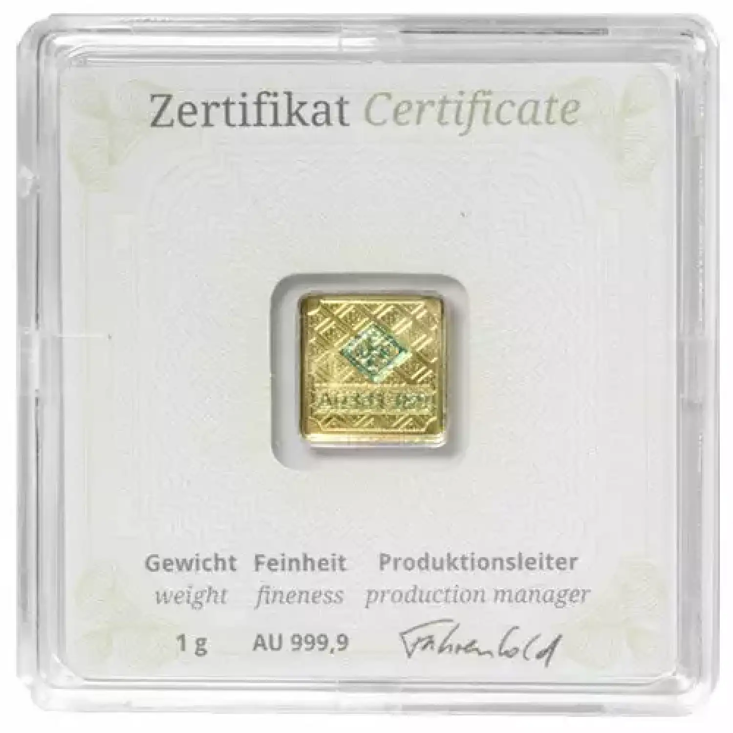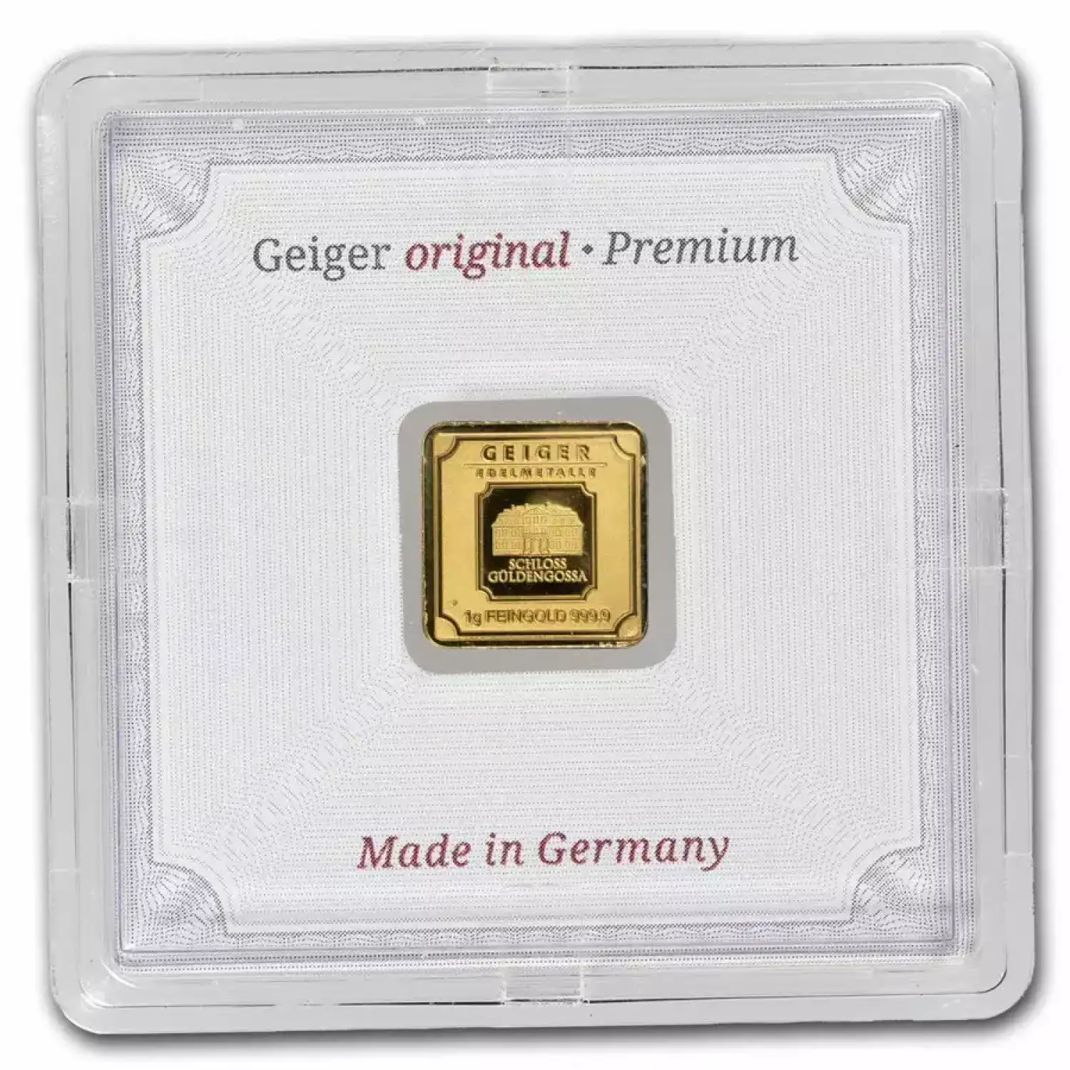 Weighing 1 gram and made from .9999 fine gold, this square-shaped bar is an ideal choice for both investors and collectors seeking to diversify their portfolios or add to their precious metals holdings. The bar features the Geiger Edelmetalle logo stamped on one side, along with its weight and purity specifications.
