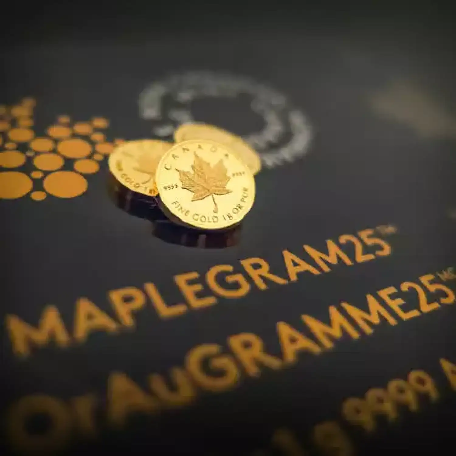 This 2015 25 Gram Canadian Gold MapleGram comes complete with 25 – 1 gram Maple Leaf coins in Brilliant Unciruclated condition. Each coin contained within the assay also features .9999 pure gold and a $.50 CAD face value. This gives the MapleGram a $12.50 CAD total face value as well as 25 grams (.804 oz) of pure gold.