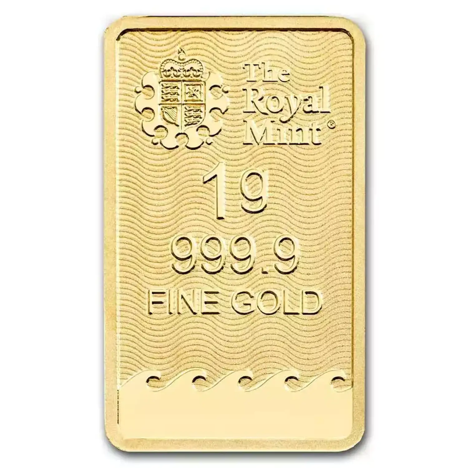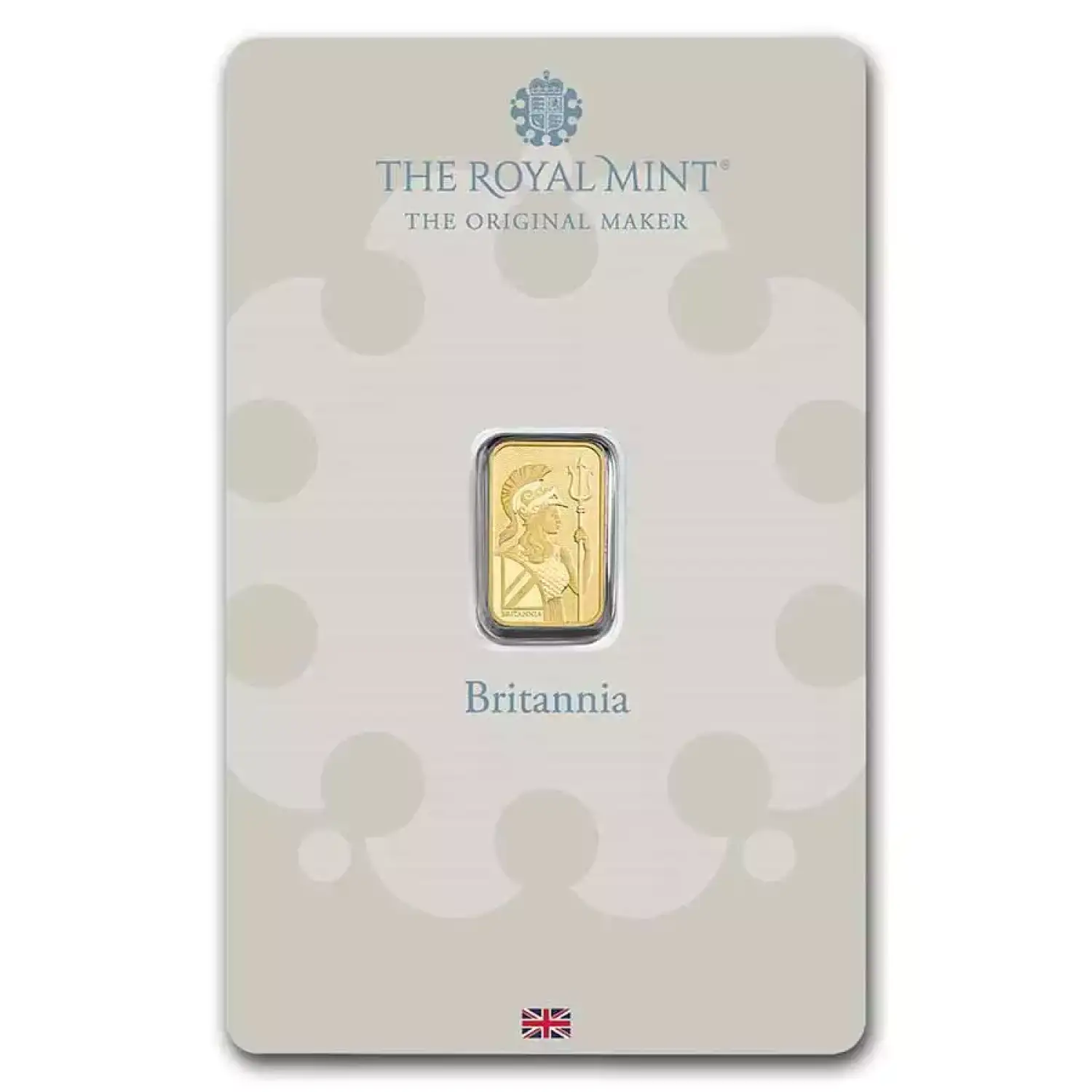 The iconic Britannia, celebrated for its presence on British coins, now graces The Royal Mint's exquisite 1 gram .9999 fine Gold bar, securely encased in a certified assay card.