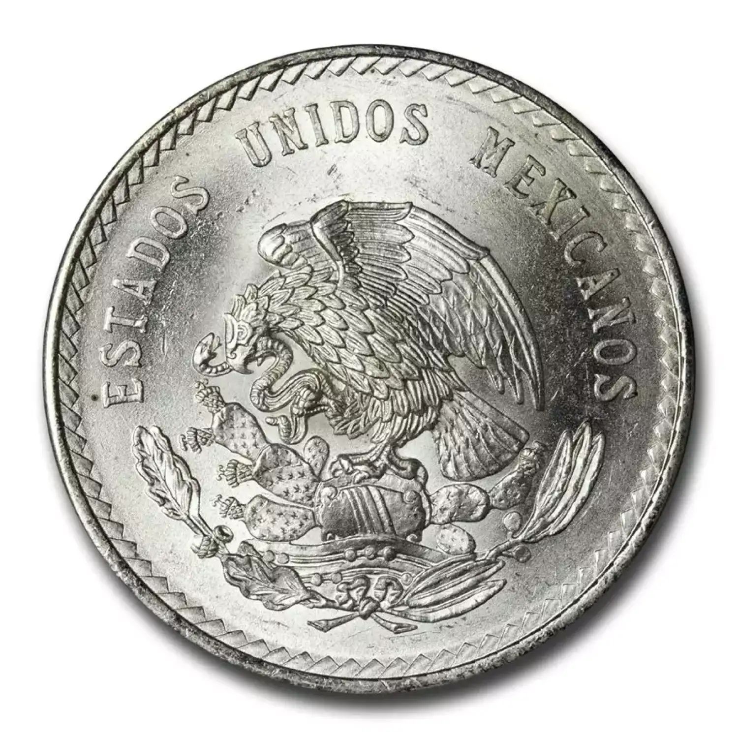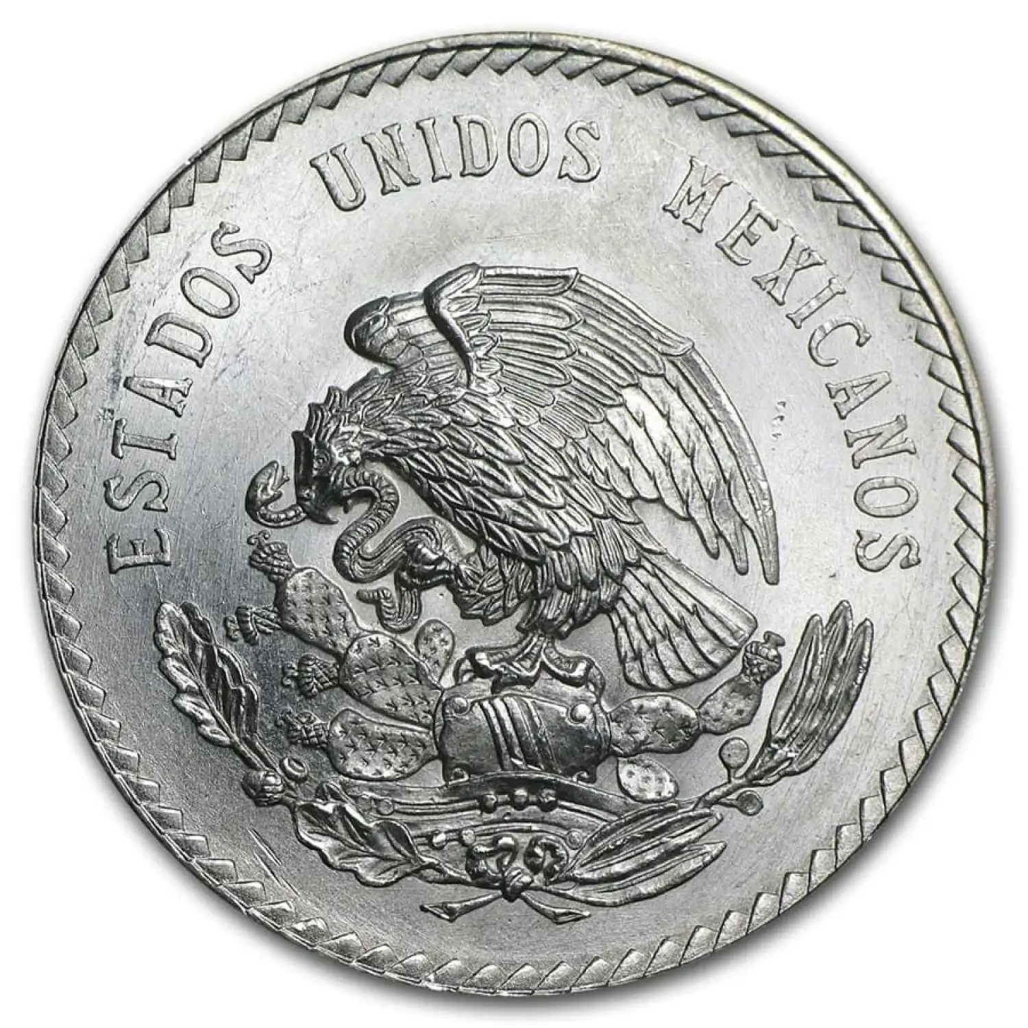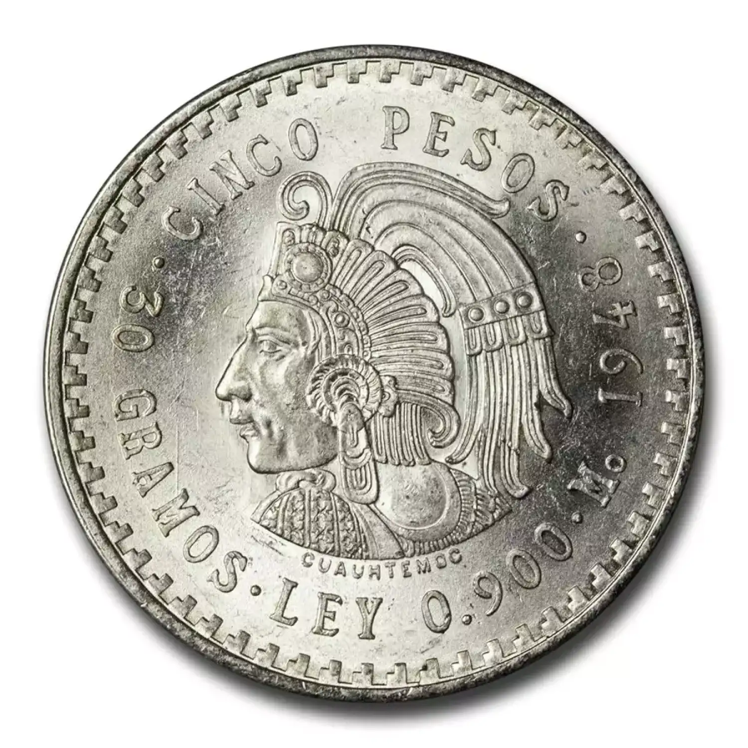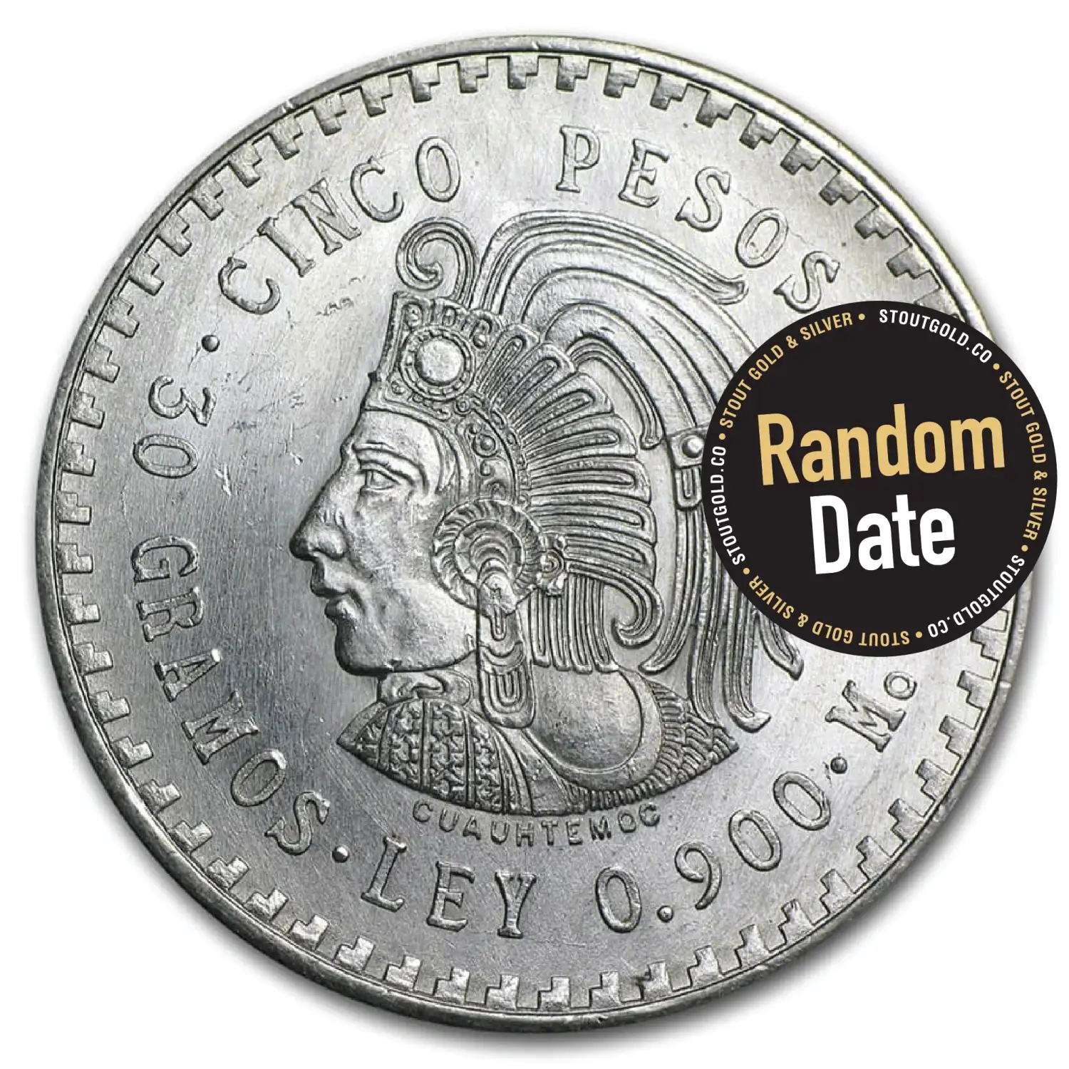 One of the most popular vintage Mexican coin designs, this 2-year-type coin features a stylized depiction of the last Aztec emperor, giving a distinctly Mesoamerican appearance to this crown-sized Silver coin.