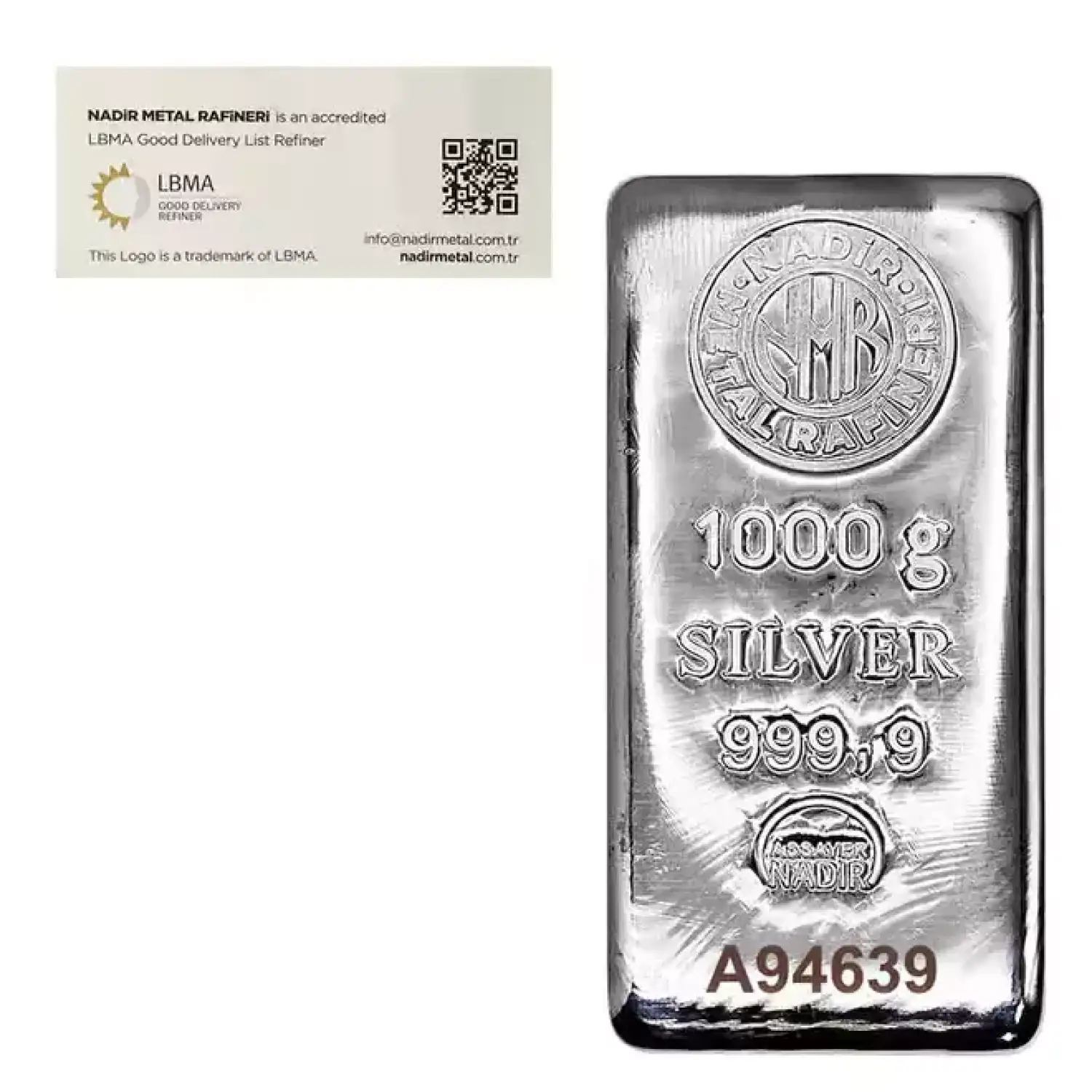 Nadir Refining is a highly respected world refinery accredited by the London Good Delivery Association (LBMA) for both gold and silver. This Nadir Refining 1 kilo Poured Silver Bar offering is a beautiful sight to behold! The front features a large Nadir Metal Refinery logo at the top, with the 1-kilo weight and 999 Silver fineness, as well as being stamped with the NADIR Assayer seal and the bar's serial number. The reverse is blank.