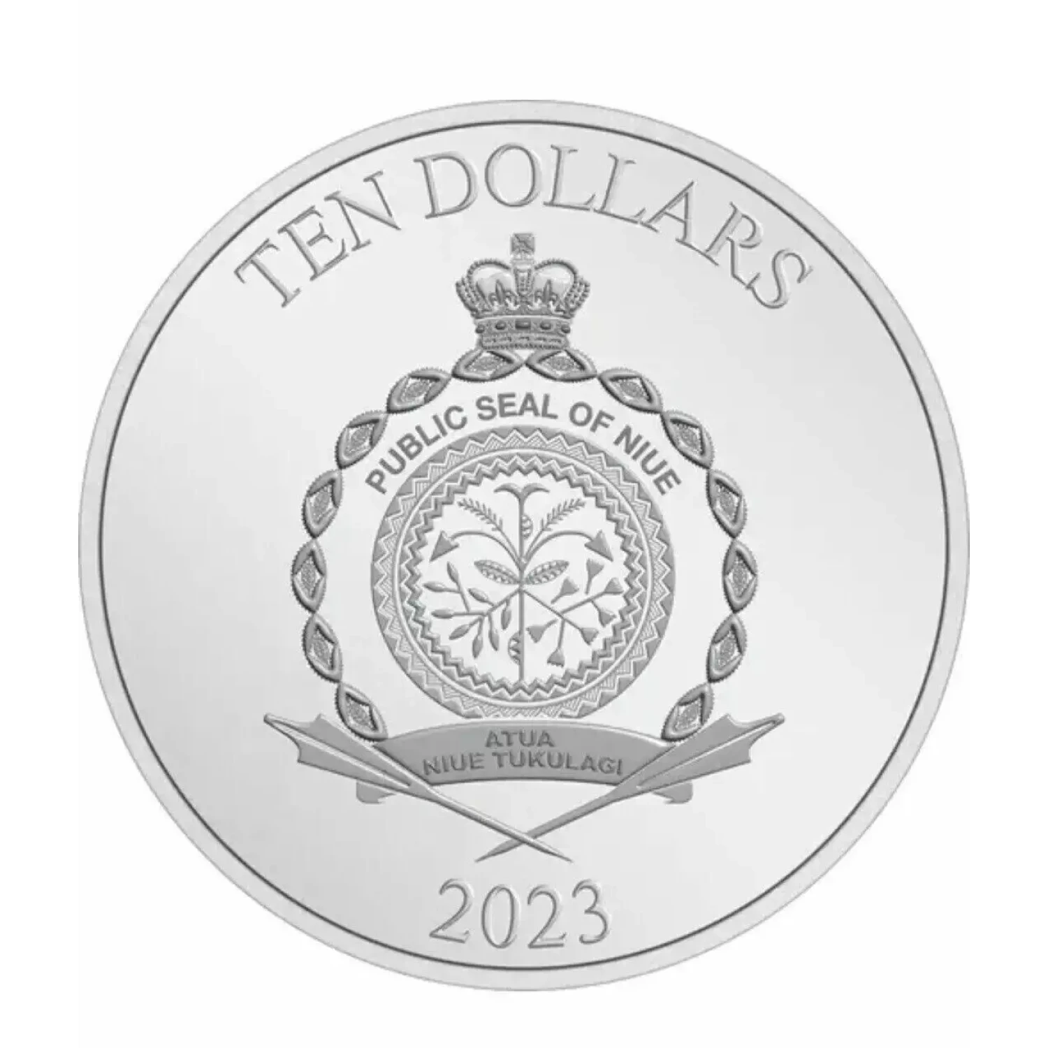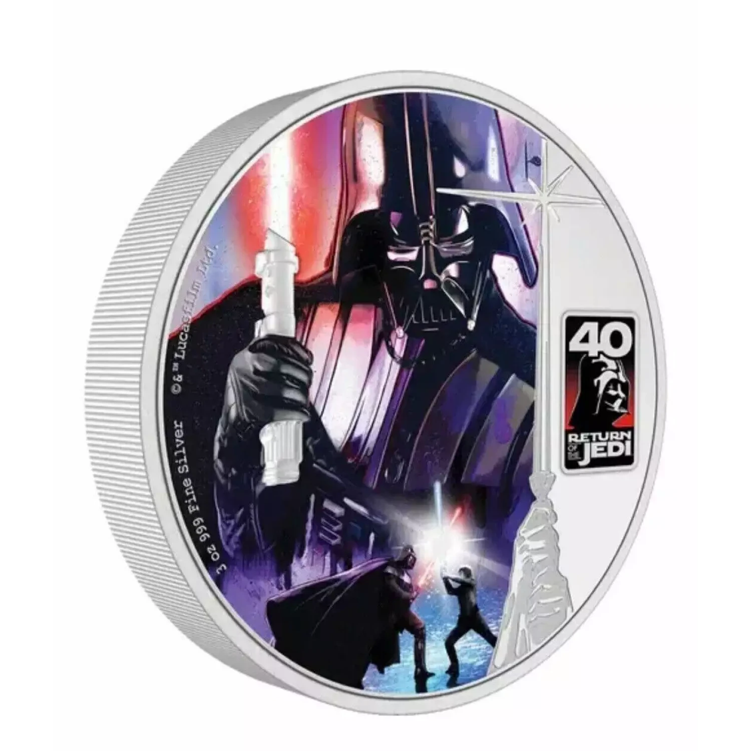 Made of 3oz pure silver and an impressive 55mm in diameter, this round coin features striking imagery of Darth Vader™, including the pivotal scene from the film where he duels with Luke Skywalker™. The anniversary logo is also featured. Some parts have been engraved and frosted, accentuating the wonderful silver, and slight relief has been added to truly bring the design to life. This is a legal tender coin, with the obverse bearing the Public Seal of Niue.