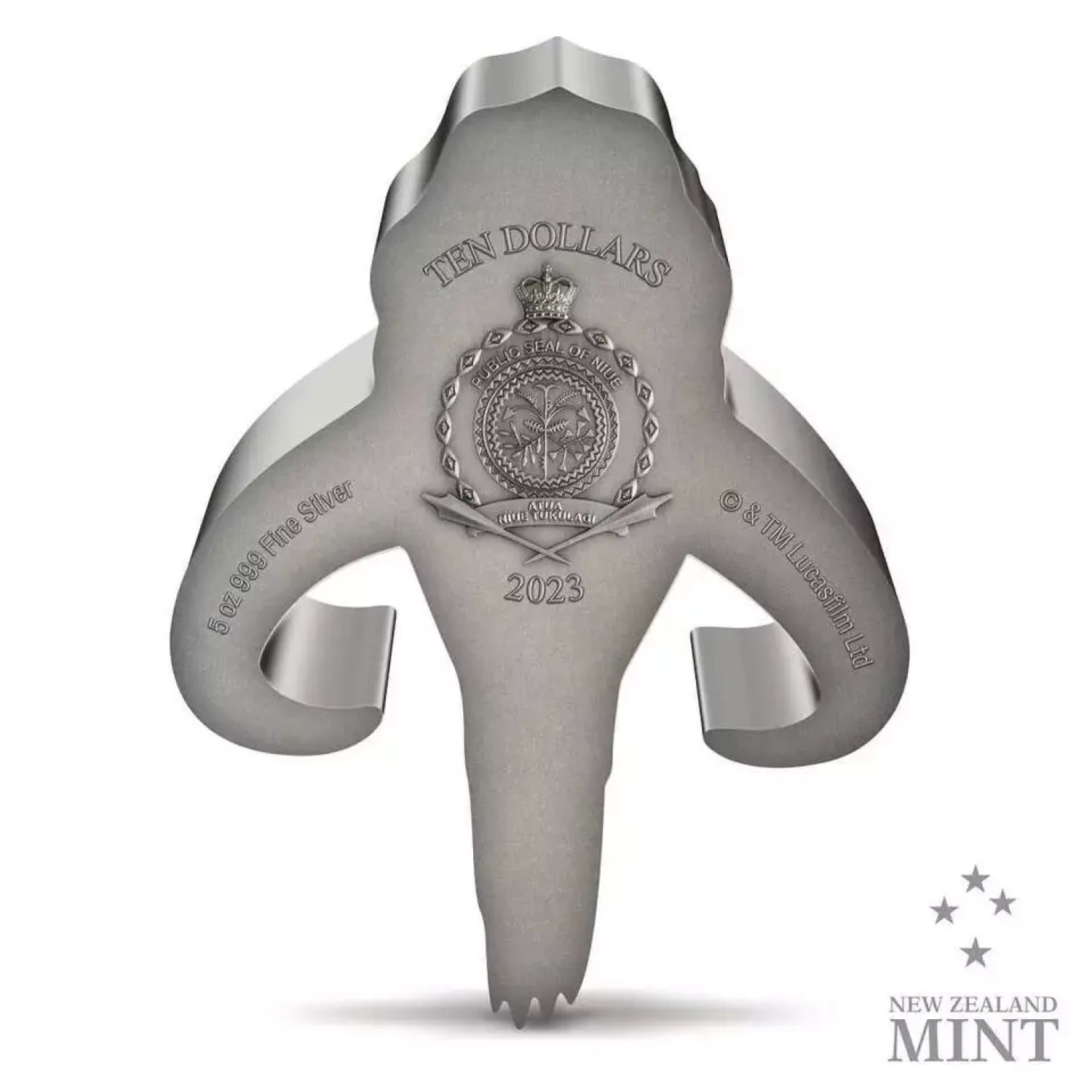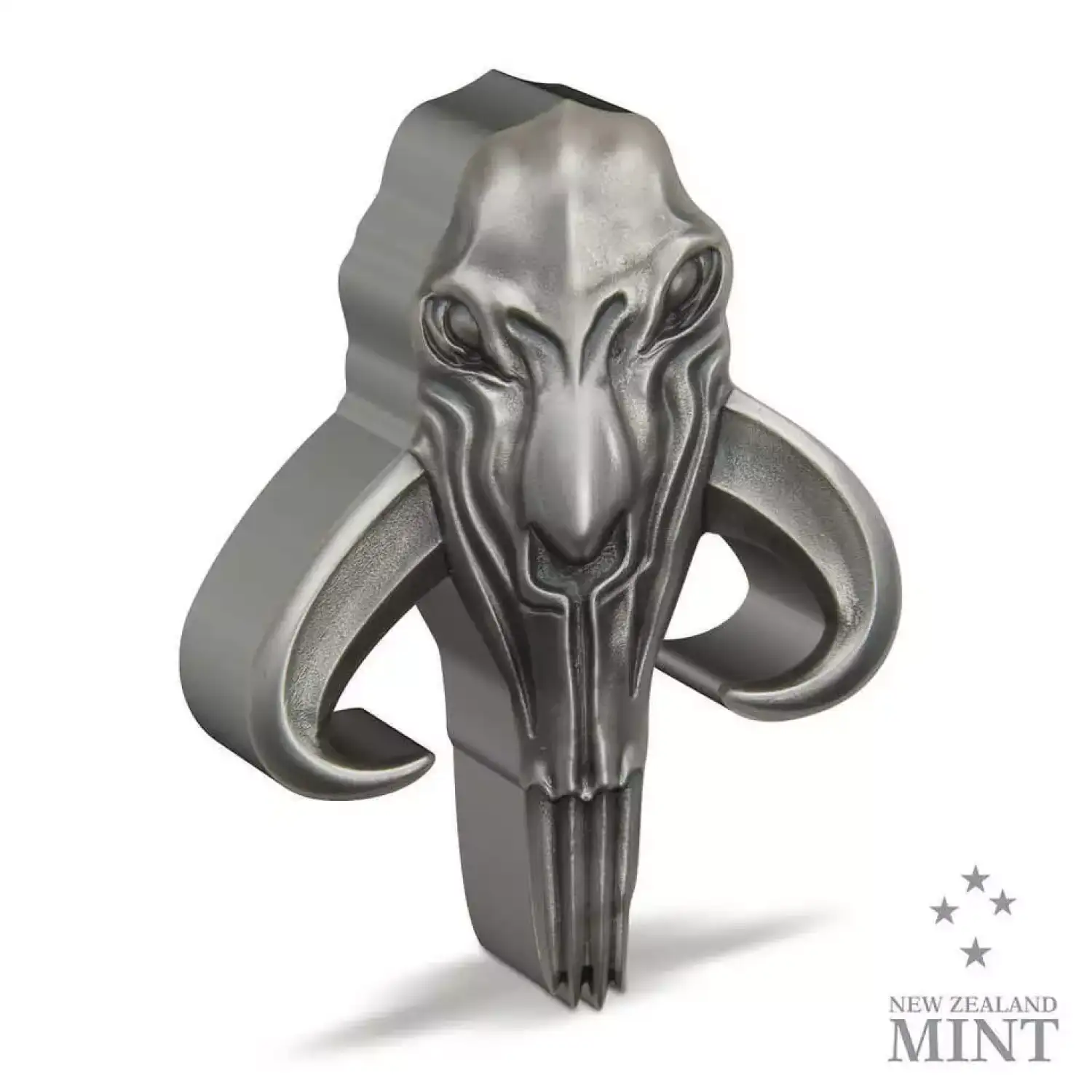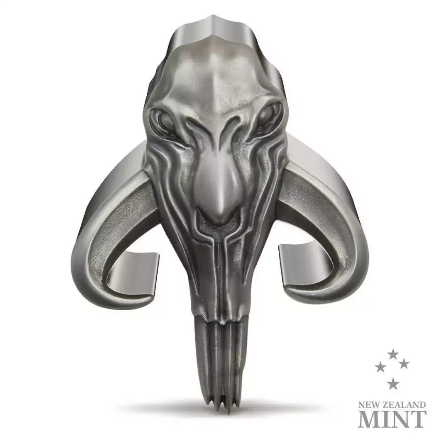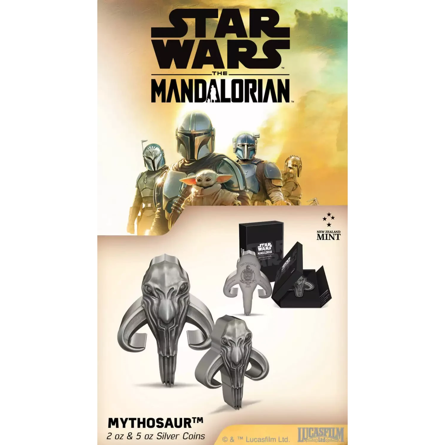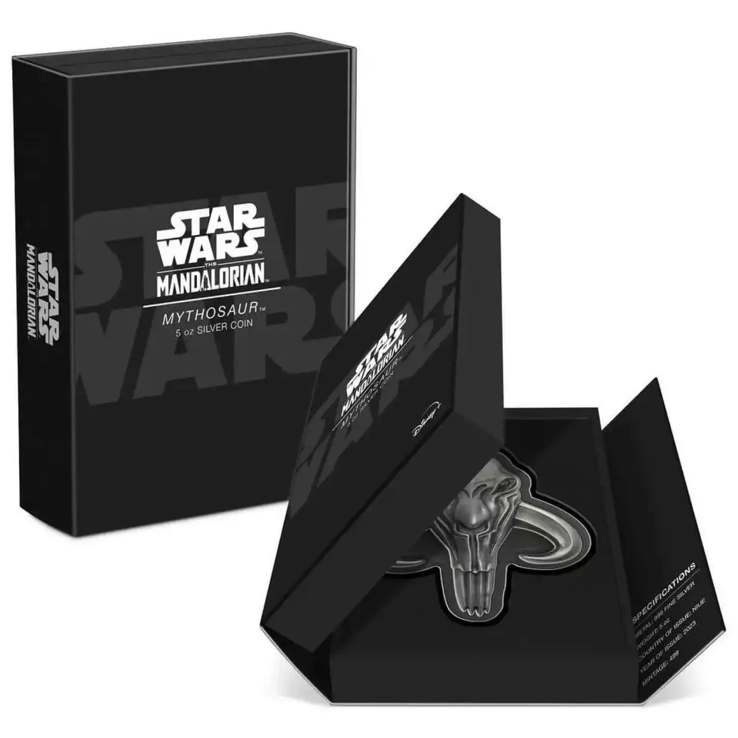 This exquisite 5oz pure silver coin pays homage to the traditional symbol of Mandalorian iconography, the Mythosaur!