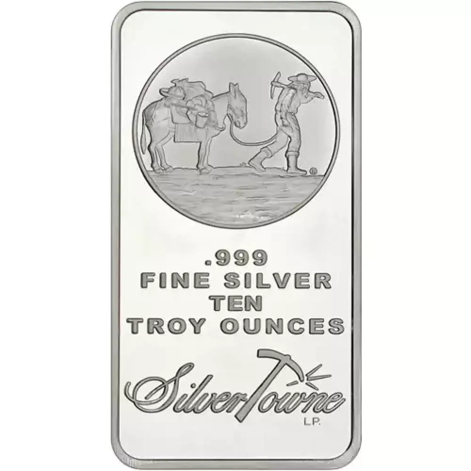 The 10oz Silver Prospector Bar from SilverTowne is a meticulously crafted investment-grade silver bullion bar, renowned for its exceptional quality and historical design. Made from .999 fine silver, this bar weighs 10 troy ounces, offering substantial value for investors and collectors alike. Each bar features a classic prospector motif, evoking the spirit of the American frontier and the excitement of the silver rush era. With its sleek finish and precise engraving, the Silver Prospector Bar not only serves as a tangible asset for wealth preservation but also as a timeless piece of Americana. Whether you're a seasoned investor or a passionate collector, this bar represents a symbol of enduring value and heritage.