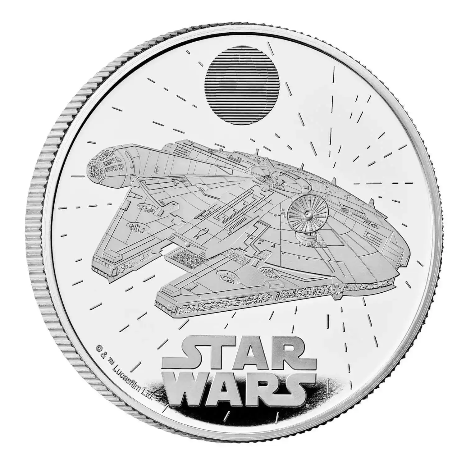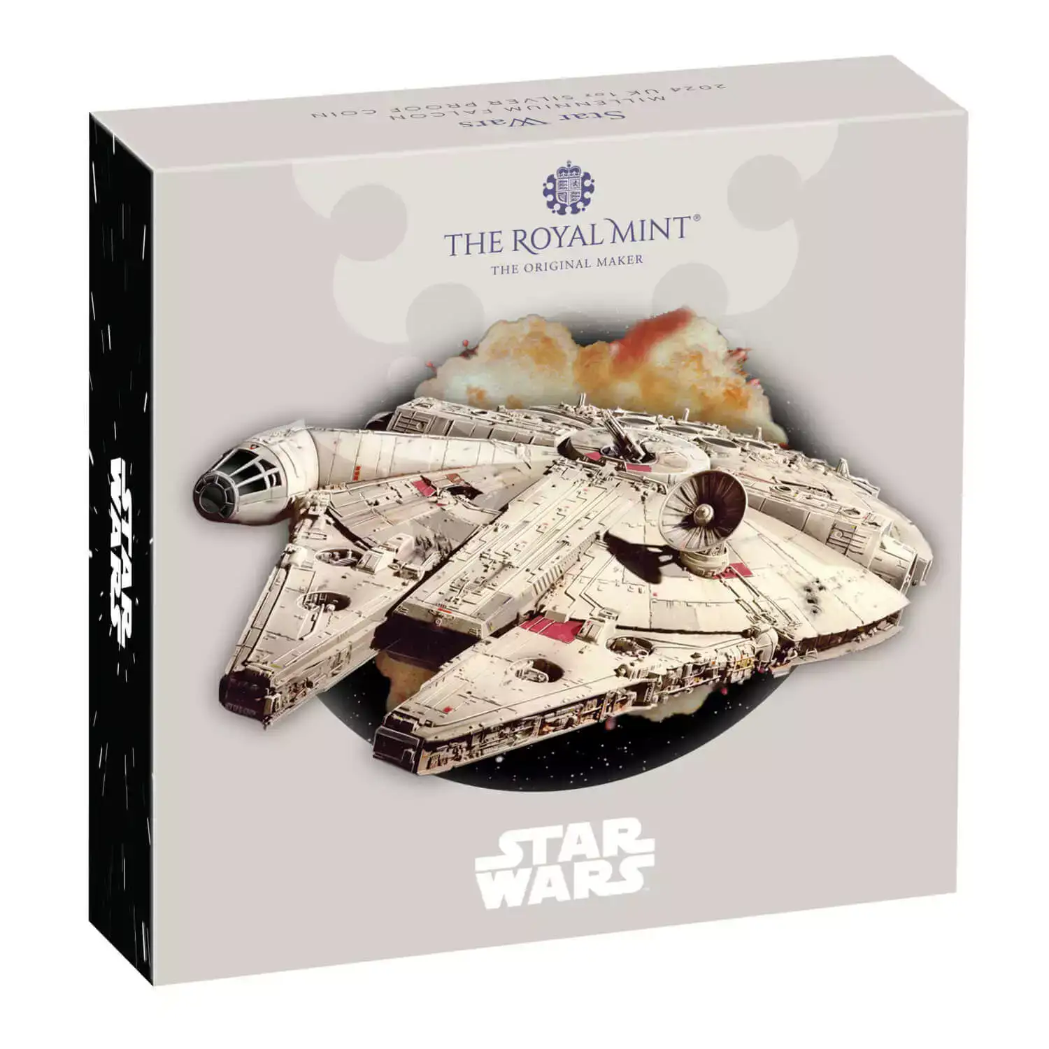 Step into the Star Wars universe with the 2024 Great Britain Millennium Falcon 1 oz Silver Proof Coin. Crafted with precision and adorned with intricate detailing, this coin celebrates the iconic Millennium Falcon spaceship. Minted in one ounce of 99.9% pure silver, it's a prized collectible for any Star Wars enthusiast or coin collector. With a limited mintage, this officially licensed coin captures the essence of the galaxy's most famous spaceship, making it a must-have addition to any collection.