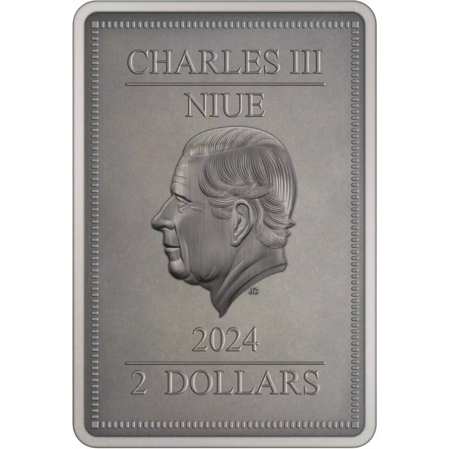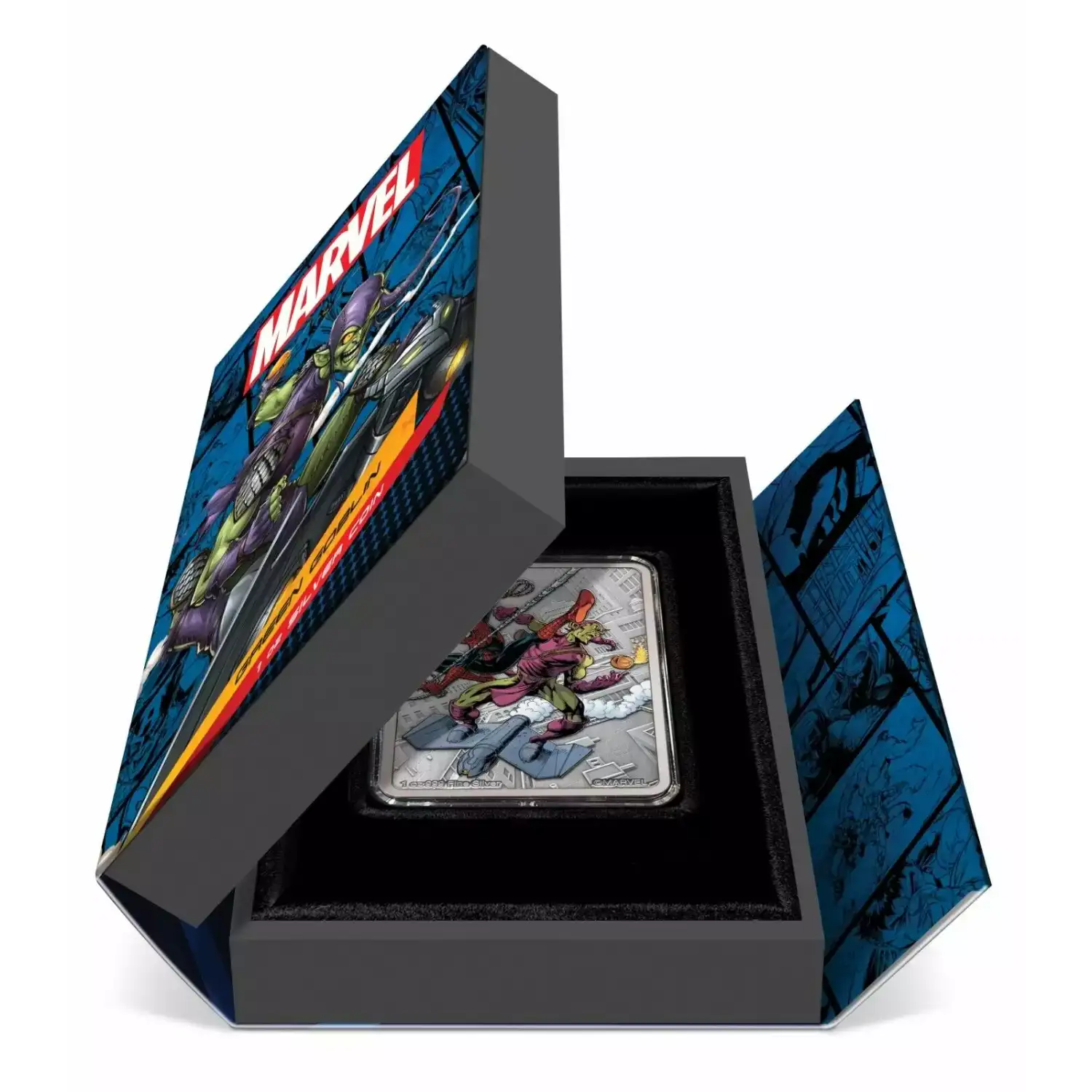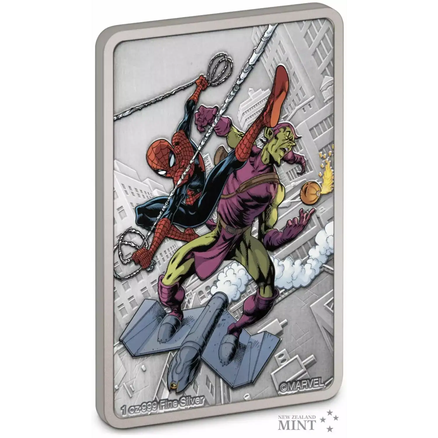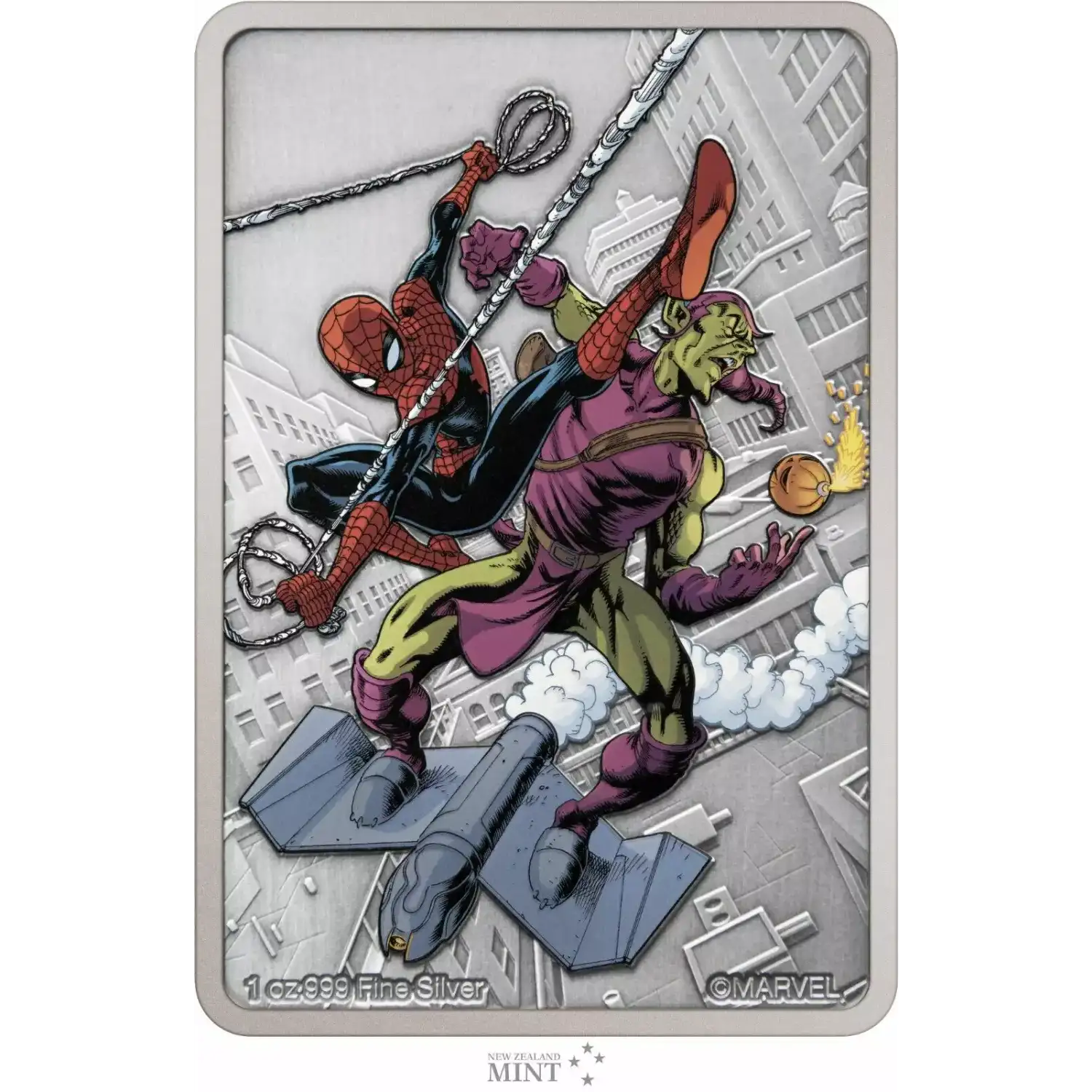 This remarkable 1 oz Silver coin is the second release in a new series dedicated to Spider-Man and his iconic villains, featuring the Green Goblin. The coin presents a vivid, colored depiction of Spider-Man battling the Green Goblin, accentuated with a stunning antique finish. It comes in a themed case and includes a Certificate of Authenticity. Limited mintage of only 2,000 pieces worldwide!
