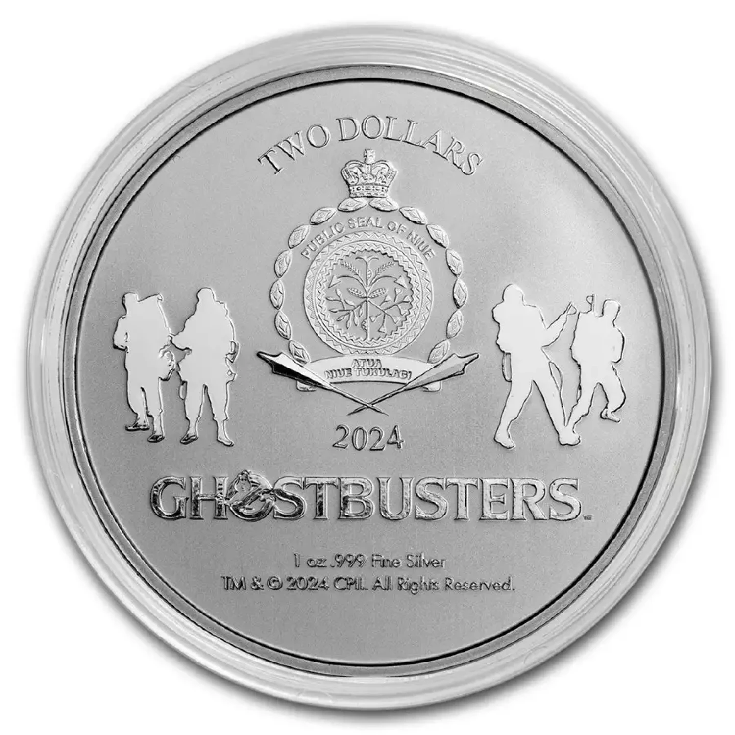 - Obverse: Displays the Niue coat of arms, face value, year, and silhouettes of the Ghostbusters, along with metal weight, purity, and copyright license details.