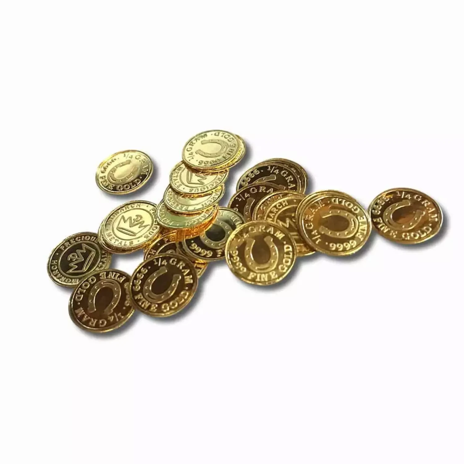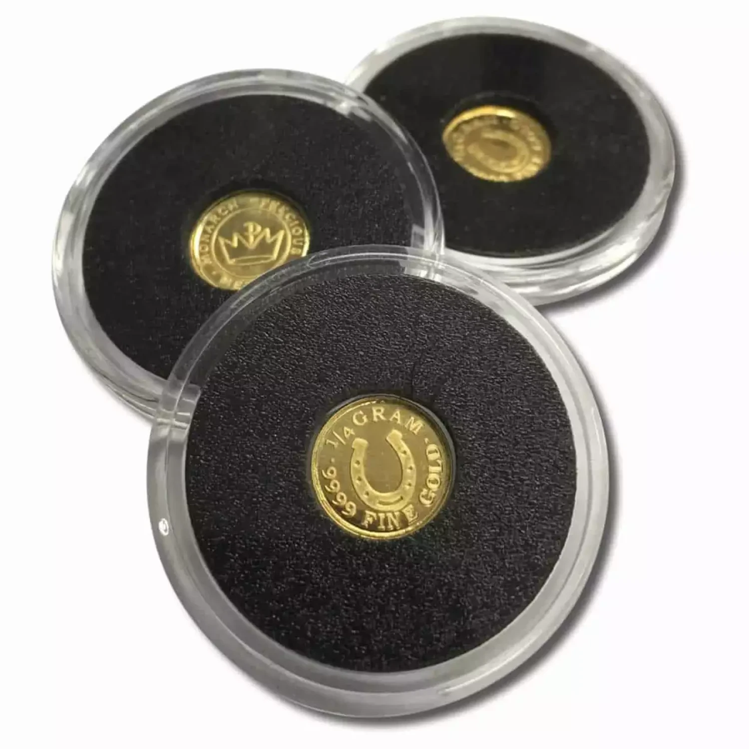 These 1/4 gram Gold rounds from Monarch Precious Metals offer an affordable way to invest in small quantities of .9999 fine Gold. Each round is securely packaged in an individual plastic capsule.