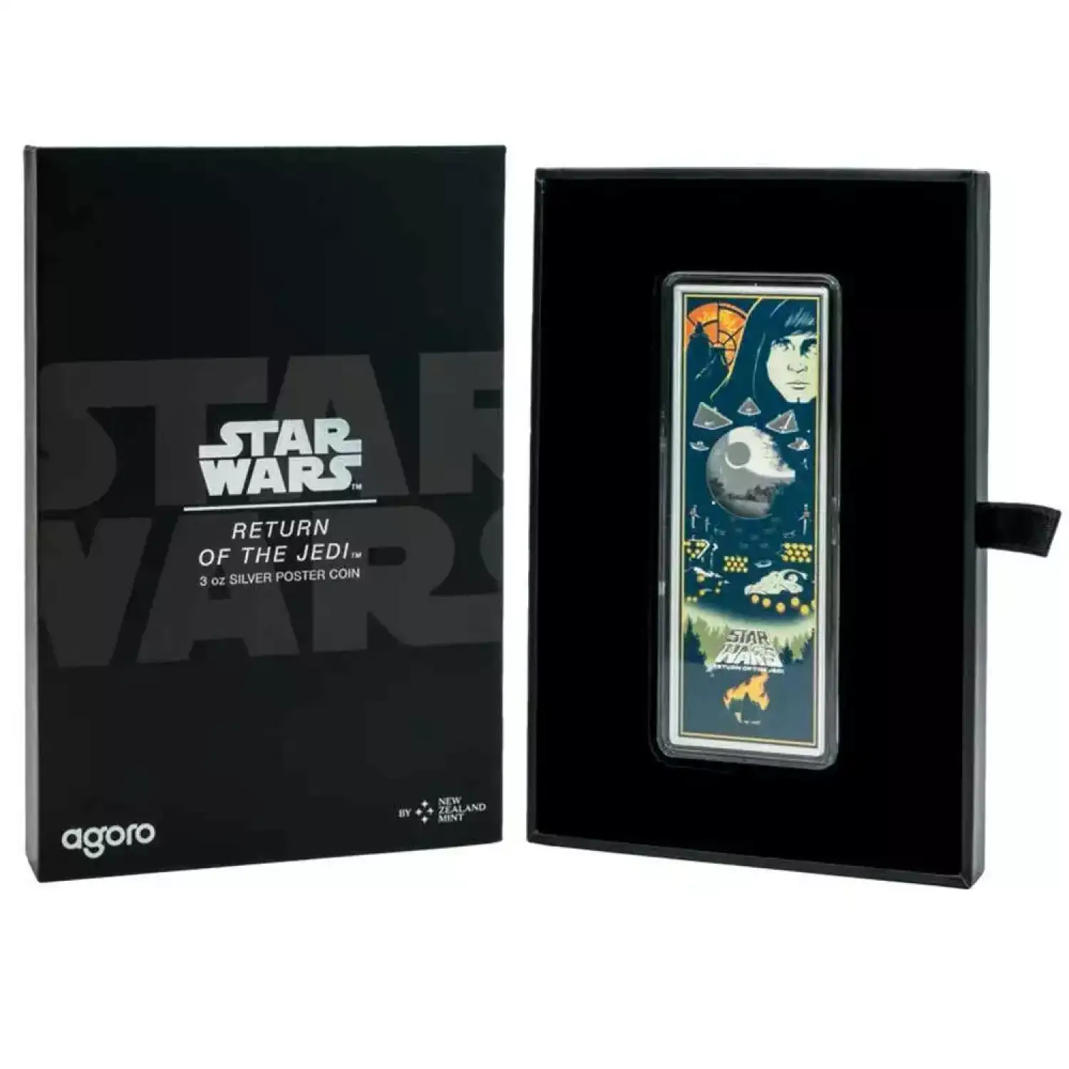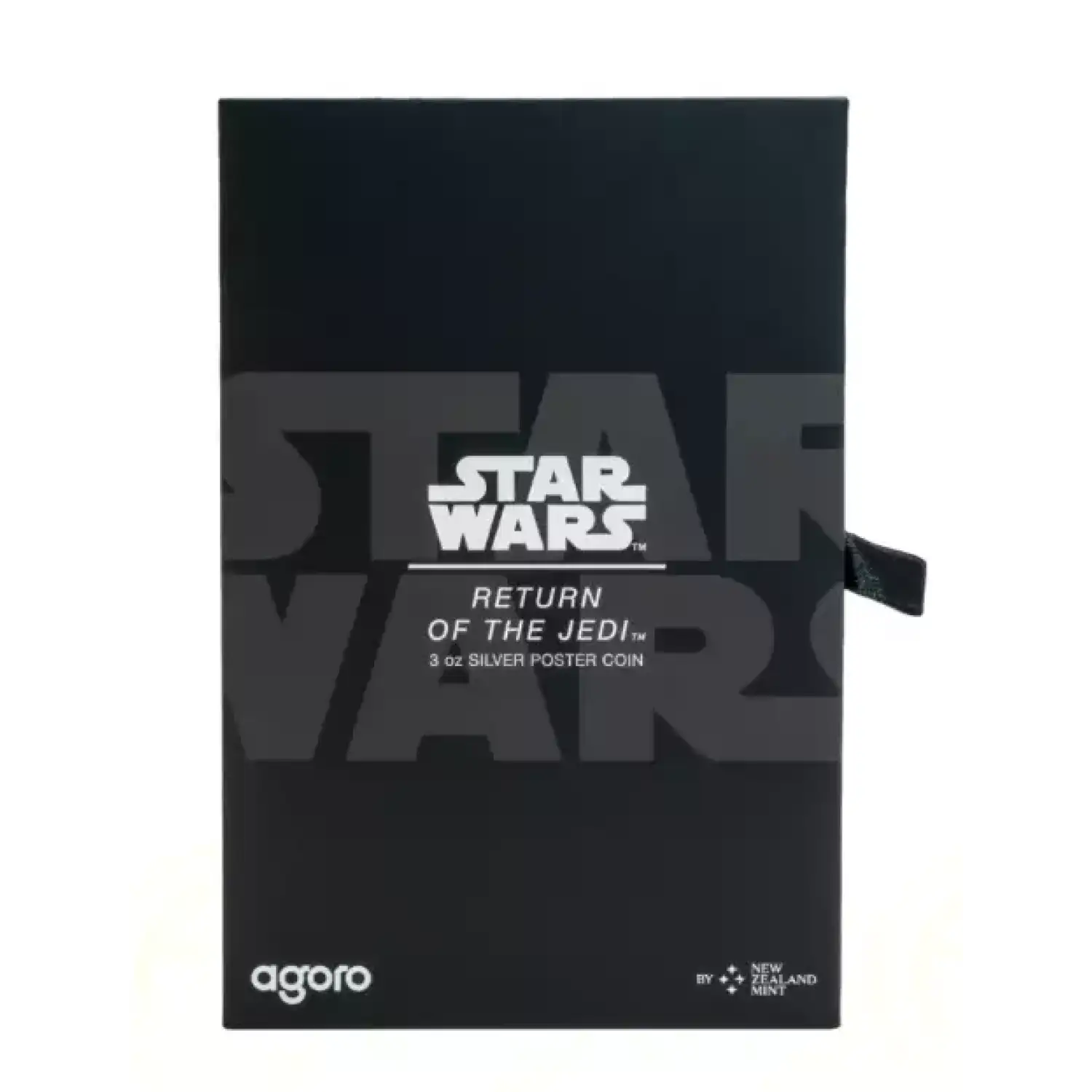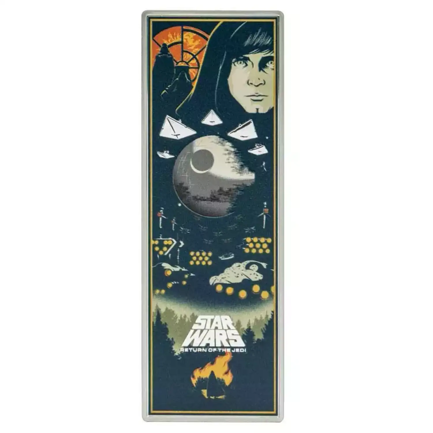Embark on an intergalactic adventure with this Star Wars: Return of the Jedi™ pure silver poster coin! As the third release in the 3 oz coin series celebrating iconic poster artwork from the Skywalker saga, this collectible is a must-have for fans.