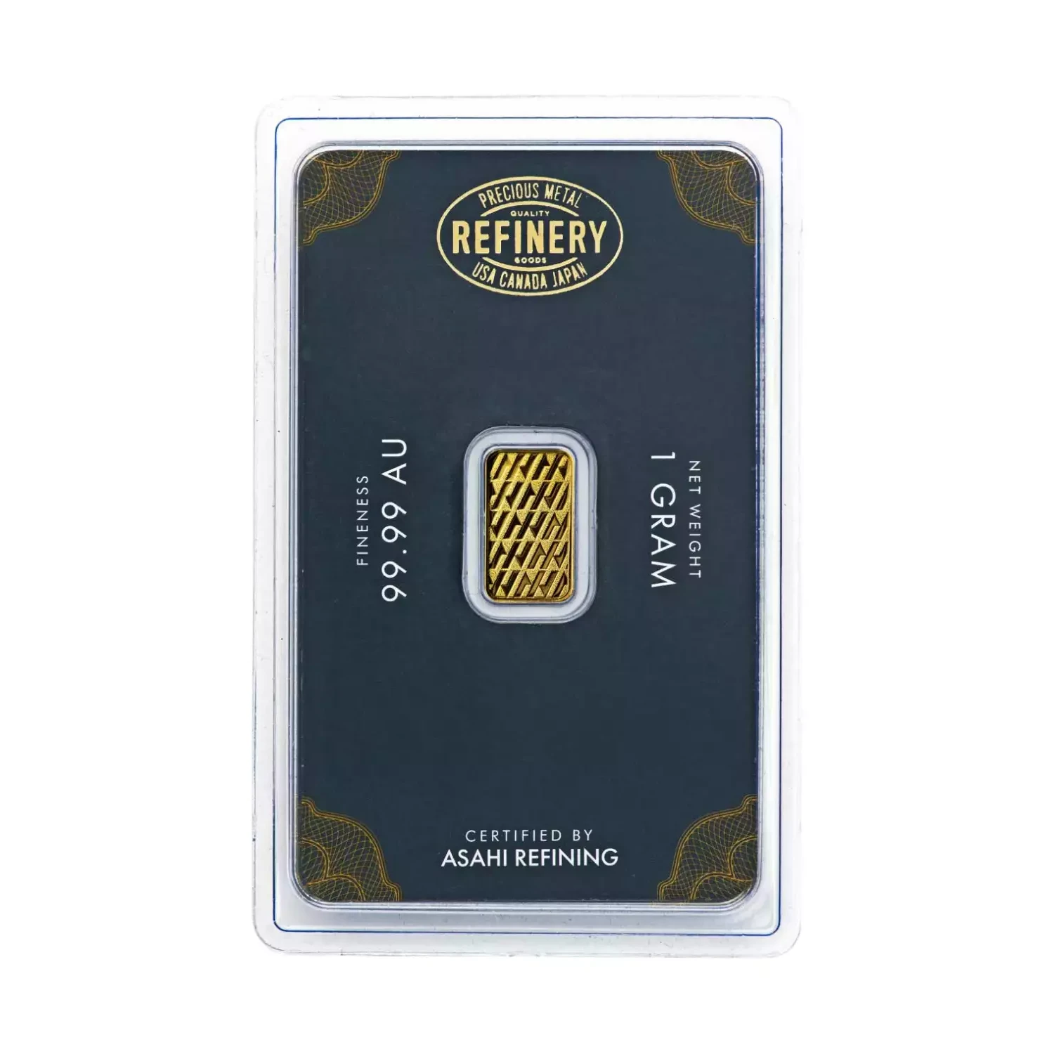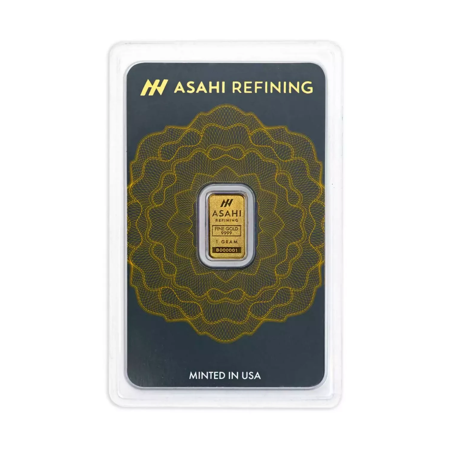 The Asahi Refining 1 Gram Gold Bar is crafted by an LBMA-accredited refiner with facilities in the U.S. and Canada, and a certified mint in Miami. The front features a debossed Asahi logo, gold purity, weight, and a unique serial number. The reverse shows a repeating Asahi “Spiral” pattern. Each bar is sealed in tamper-evident packaging with a gold-foiled assay certificate verifying weight, purity, and authenticity.