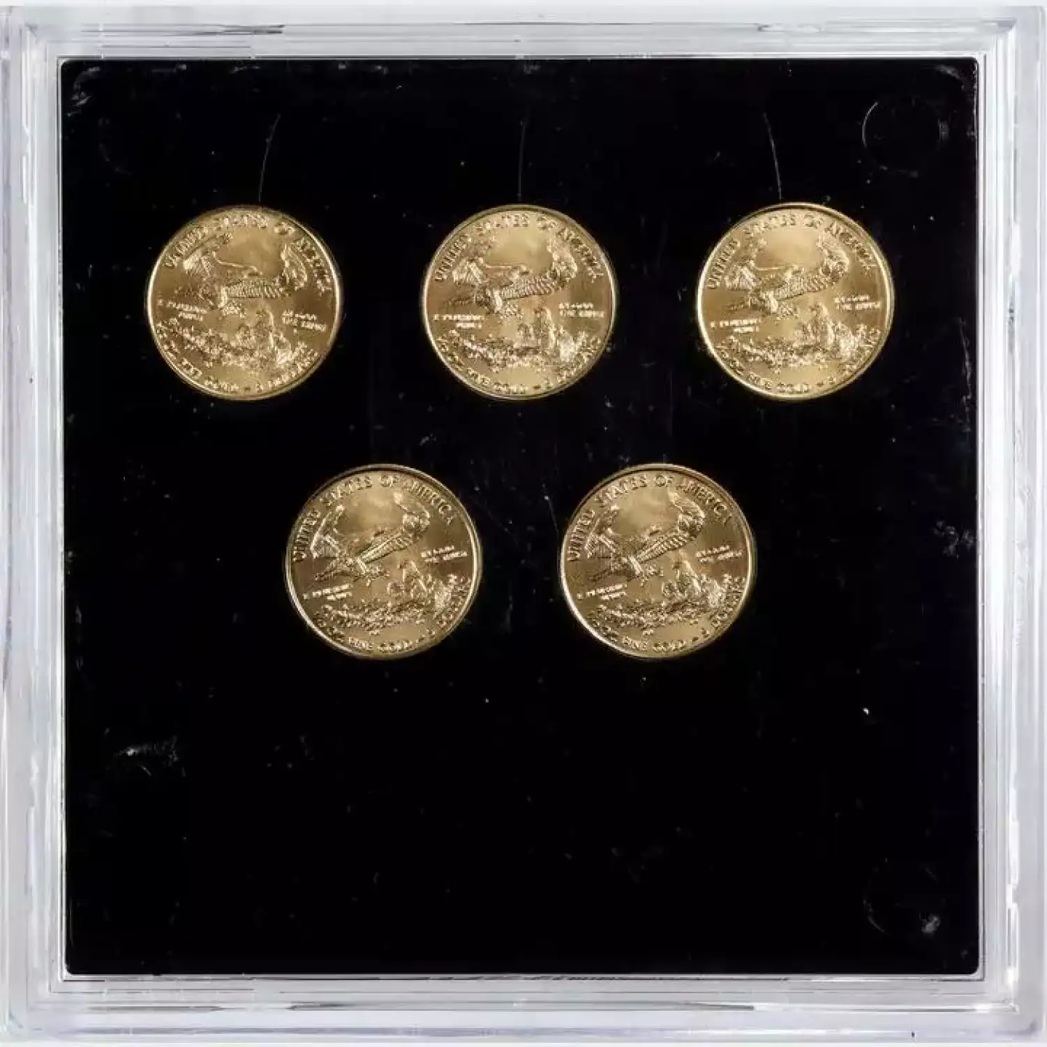 Discover the allure of the iconic American Gold Eagle with this 5-Coin 1/10oz Set. These remarkable coins showcase the enduring legacy of American craftsmanship and the timeless beauty of gold. Each coin features the stunning design that has made the American Gold Eagle a global symbol of wealth and prosperity. The obverse bears the iconic image of Lady Liberty, while the reverse showcases the majestic American bald eagle, a proud representation of the nation's strength.