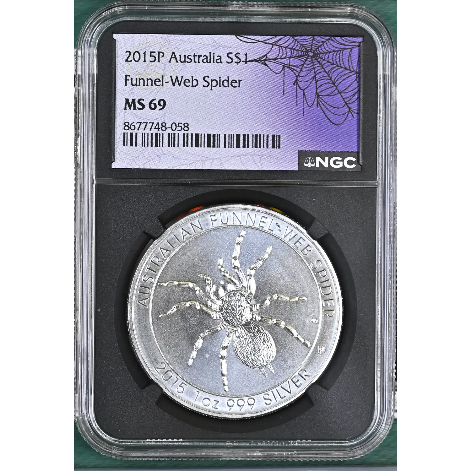 Discover the captivating 2015 P 1oz Funnel-Web Spider NGC MS-69 coin, a remarkable addition to any collector's portfolio. This stunning silver coin showcases the intricate design of the fearsome Funnel-Web Spider, one of the world's most venomous arachnids.