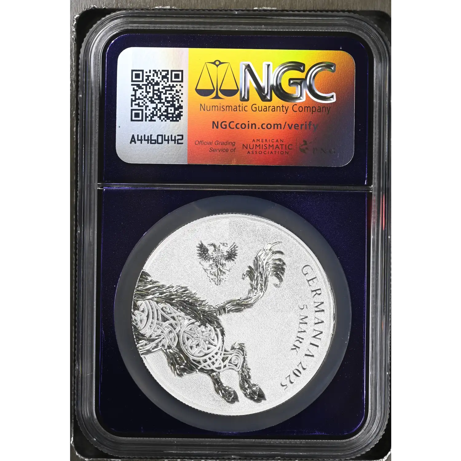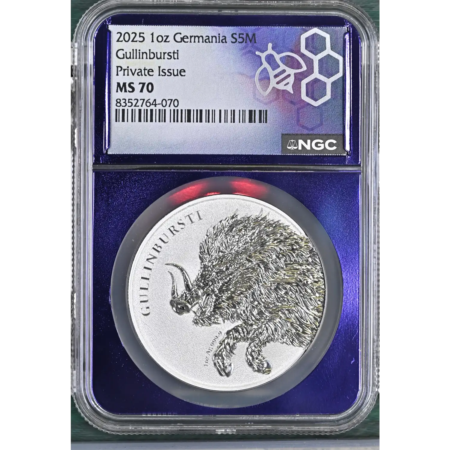 Introducing the '2025 Germania Mint 5 Mark 1oz Silver Round NGC MS-70 Gullinbursti Trader Bea Slab' - a stunning numismatic coin celebrating the rich heritage of Poland. Crafted from 1 ounce of pure .999 fine silver, this NGC MS-70 graded coin features the iconic Gullinbursti, a mythical boar from Norse mythology, symbolizing strength and prosperity.