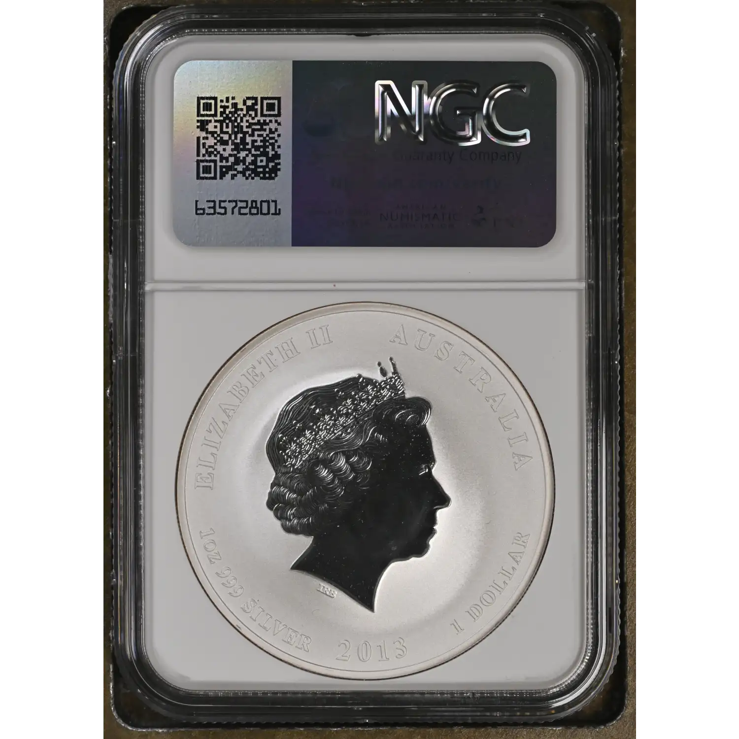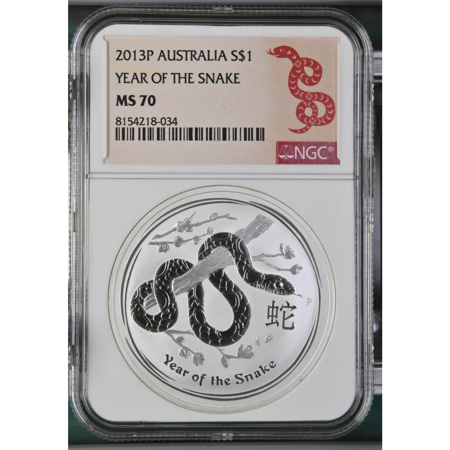 Introducing the captivating 2013 P 1oz Silver Lunar Year of the Snake NGC MS-70 coin from Australia. Crafted from 99.9% pure silver, this exceptional numismatic art captures the essence of the Chinese Zodiac and the rich cultural heritage of the Land Down Under.