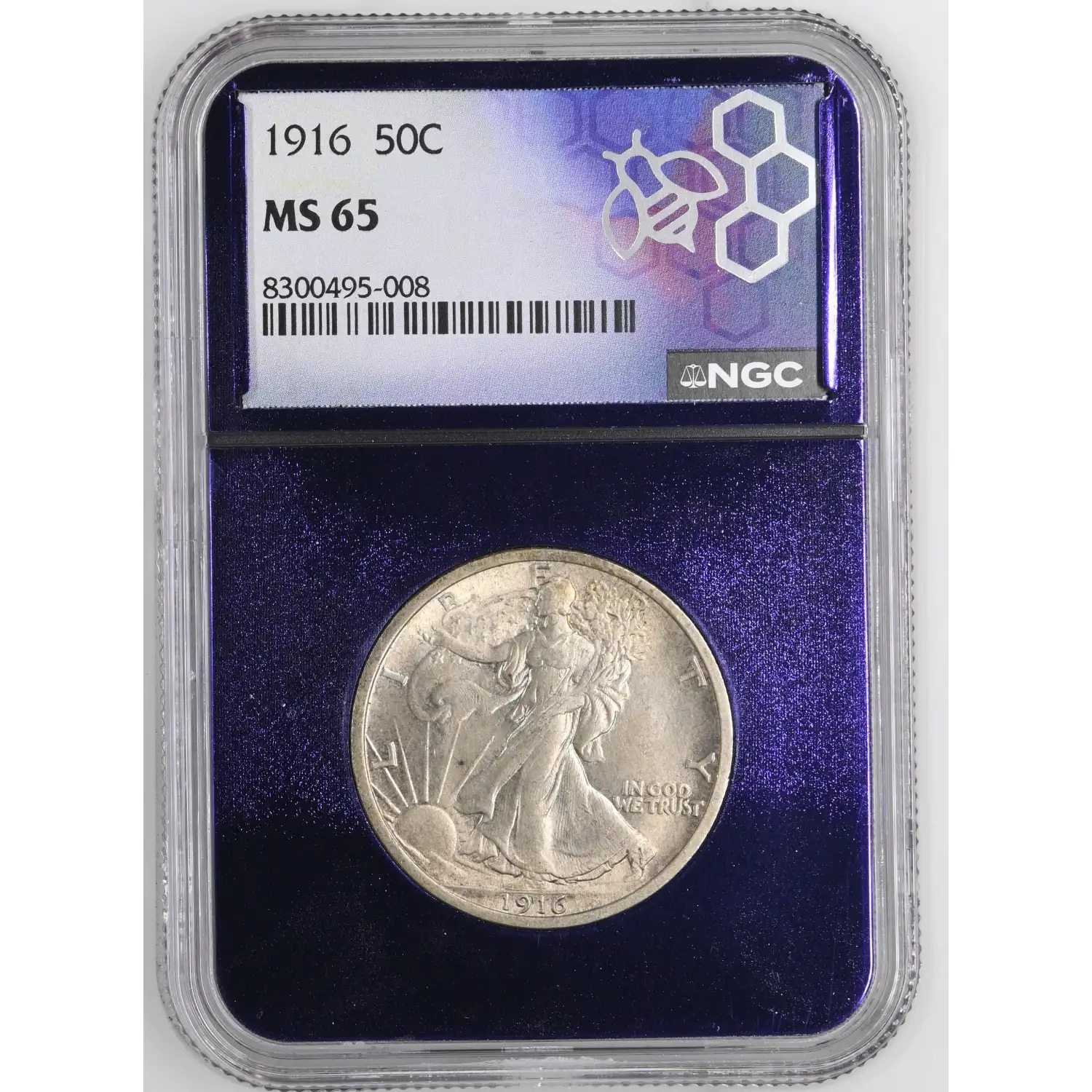 Introducing the '1916 Half Dollars Liberty Walking NGC MS-65 Purple Core', a remarkable numismatic treasure from the United States. This exquisite coin features the iconic 'Liberty Walking' design, crafted by Adolph A. Weinman, with a stunning purple core that adds a unique and mesmerizing visual appeal.