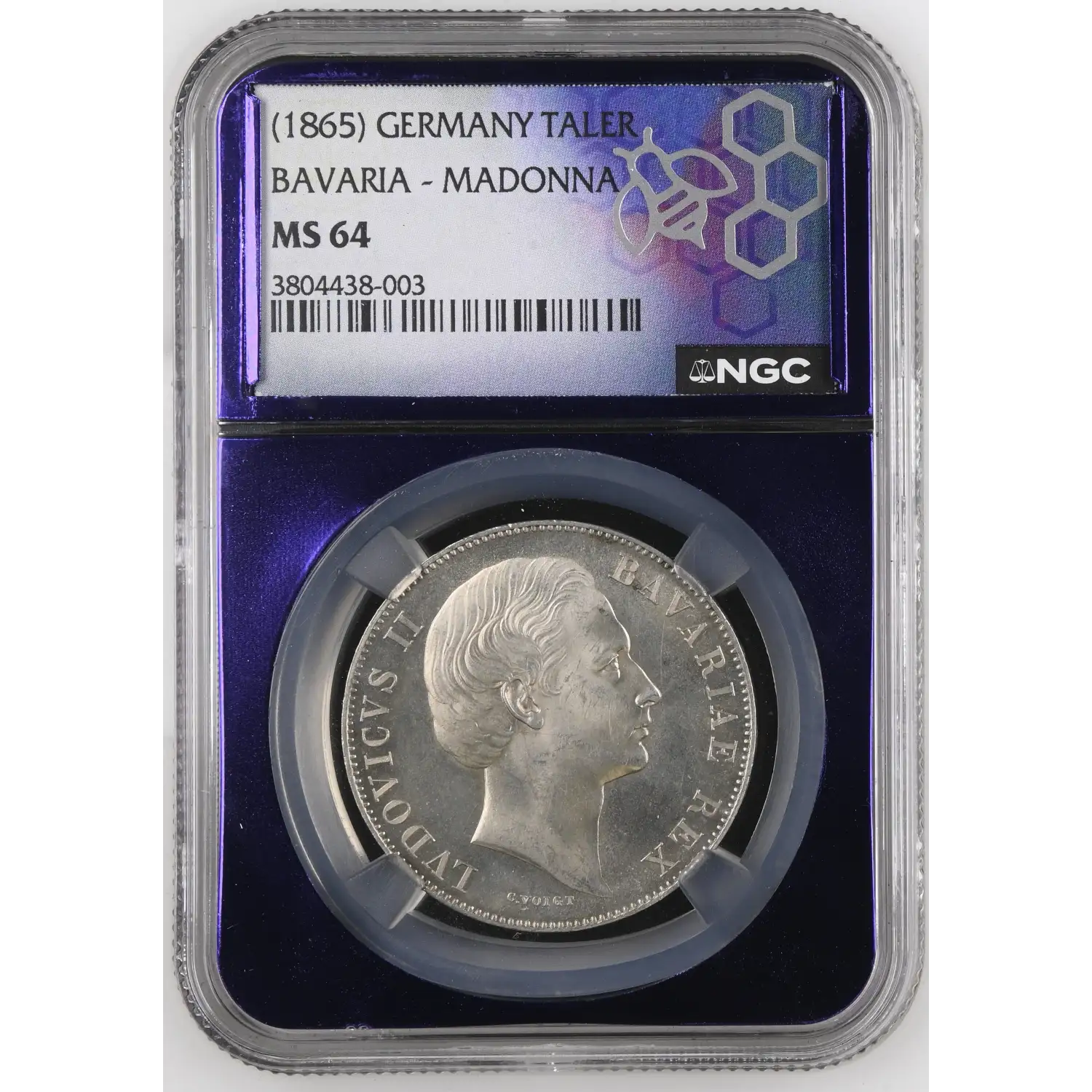 The 1865 German States Silver Thaler NGC MS-64 Bavaria - Madonna Purple Core KM#877 is a stunning numismatic relic that offers a glimpse into the rich history and artistry of the German States. This magnificent coin, graded in Mint State-64 condition by the prestigious NGC, is a testament to the skilled craftsmanship and remarkable preservation.