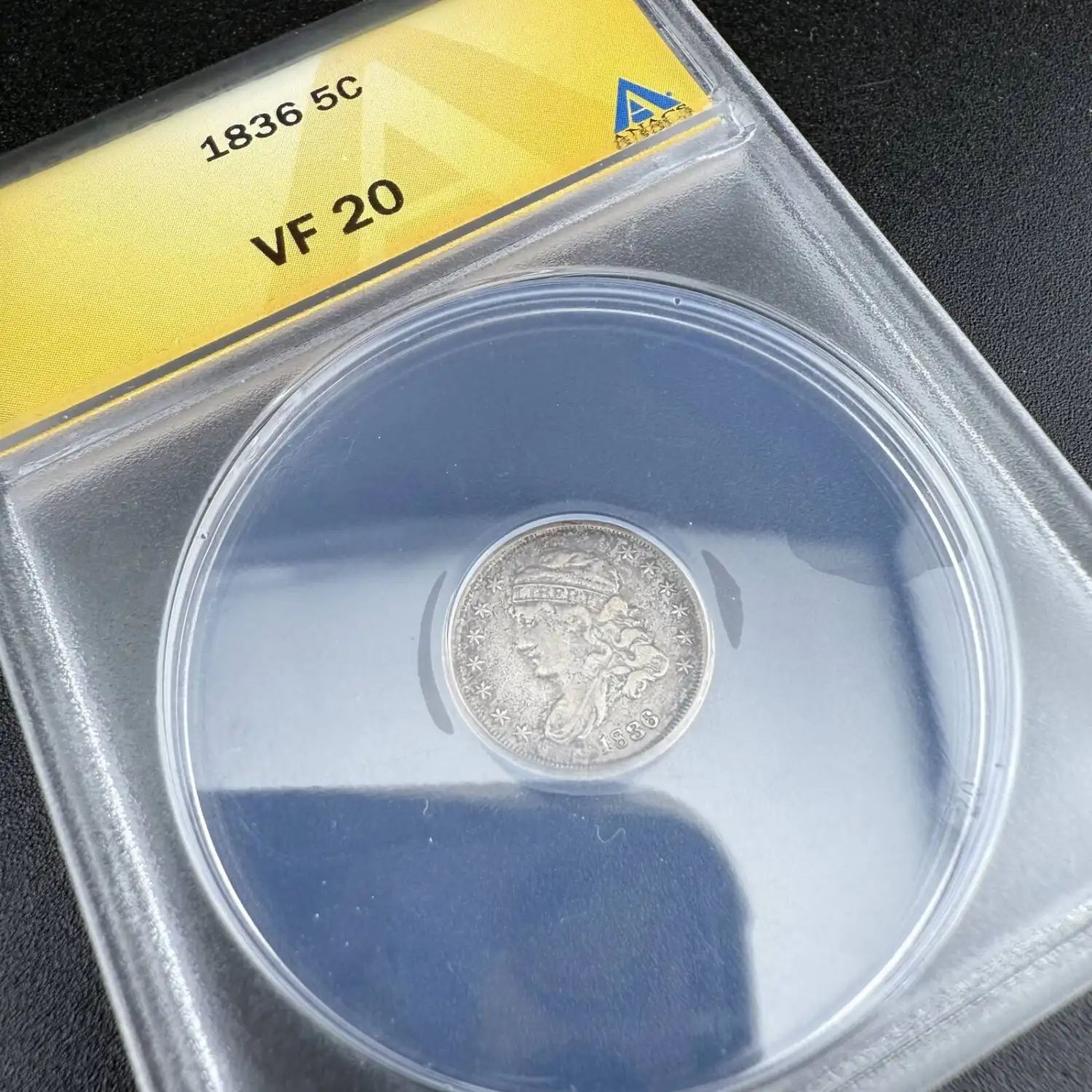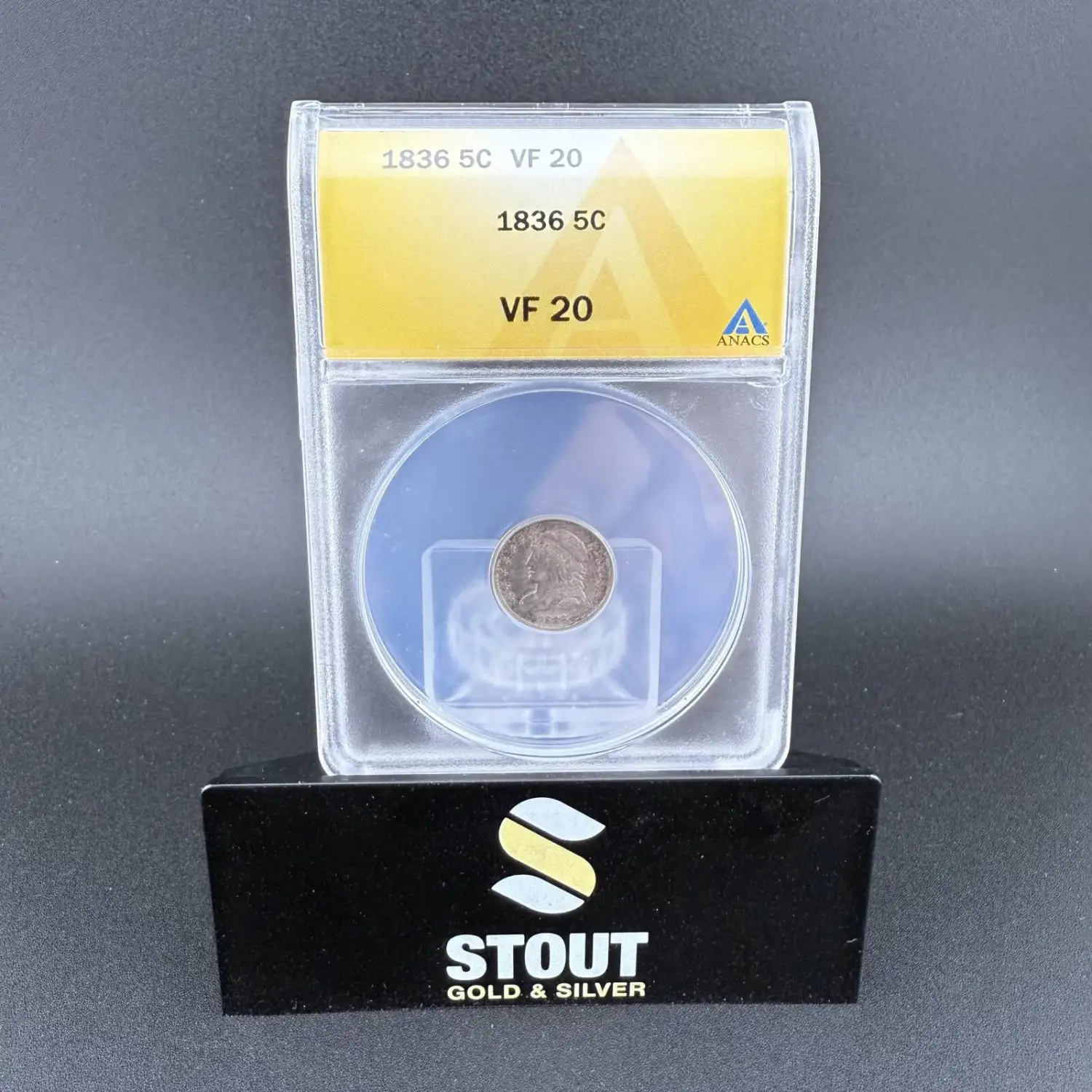 Discover the captivating 1836 Capped Bust Half Dime, a timeless piece of American numismatic history. This ANACS-graded VF-20 coin showcases the iconic Capped Bust design that was prevalent during the early 19th century.