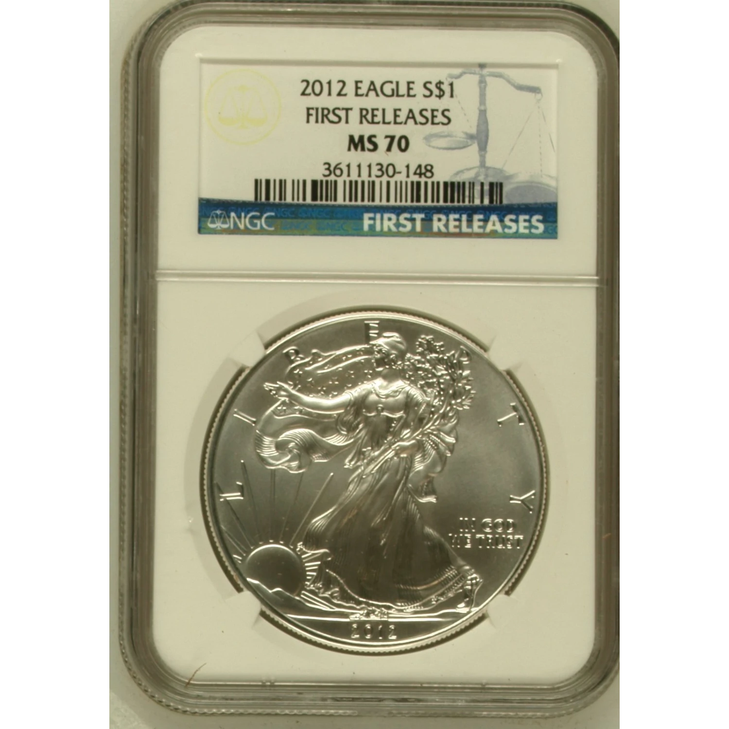 The 2012 American Silver Eagle NGC MS-70 FIRST RELEASES is a highly sought-after numismatic coin crafted from .999 fine silver. This stunning silver coin is part of the iconic American Silver Eagle series, graded by the Numismatic Guaranty Corporation (NGC) as a Mint State 70 (MS-70), indicating perfect, flawless condition. The "FIRST RELEASES" designation further enhances its value for serious coin collectors and investors.