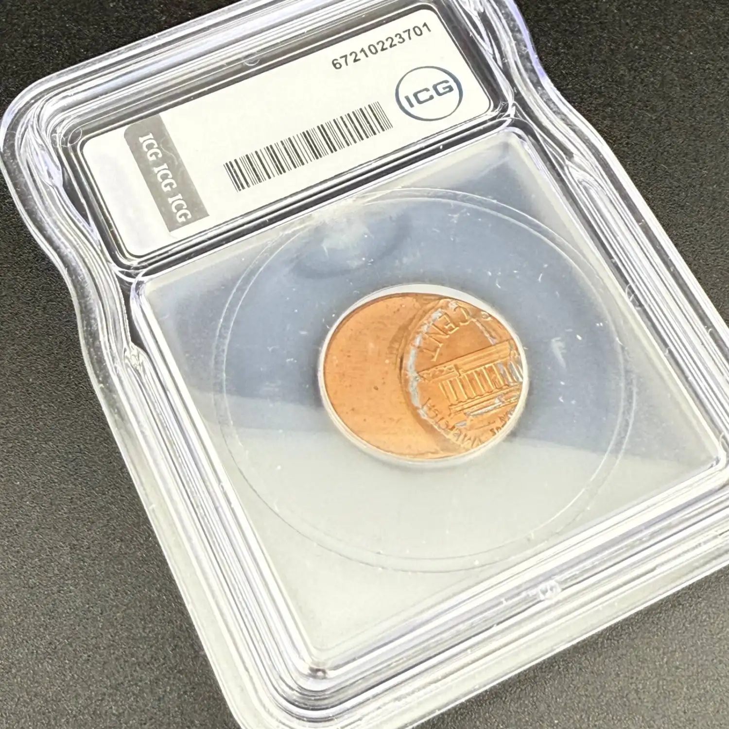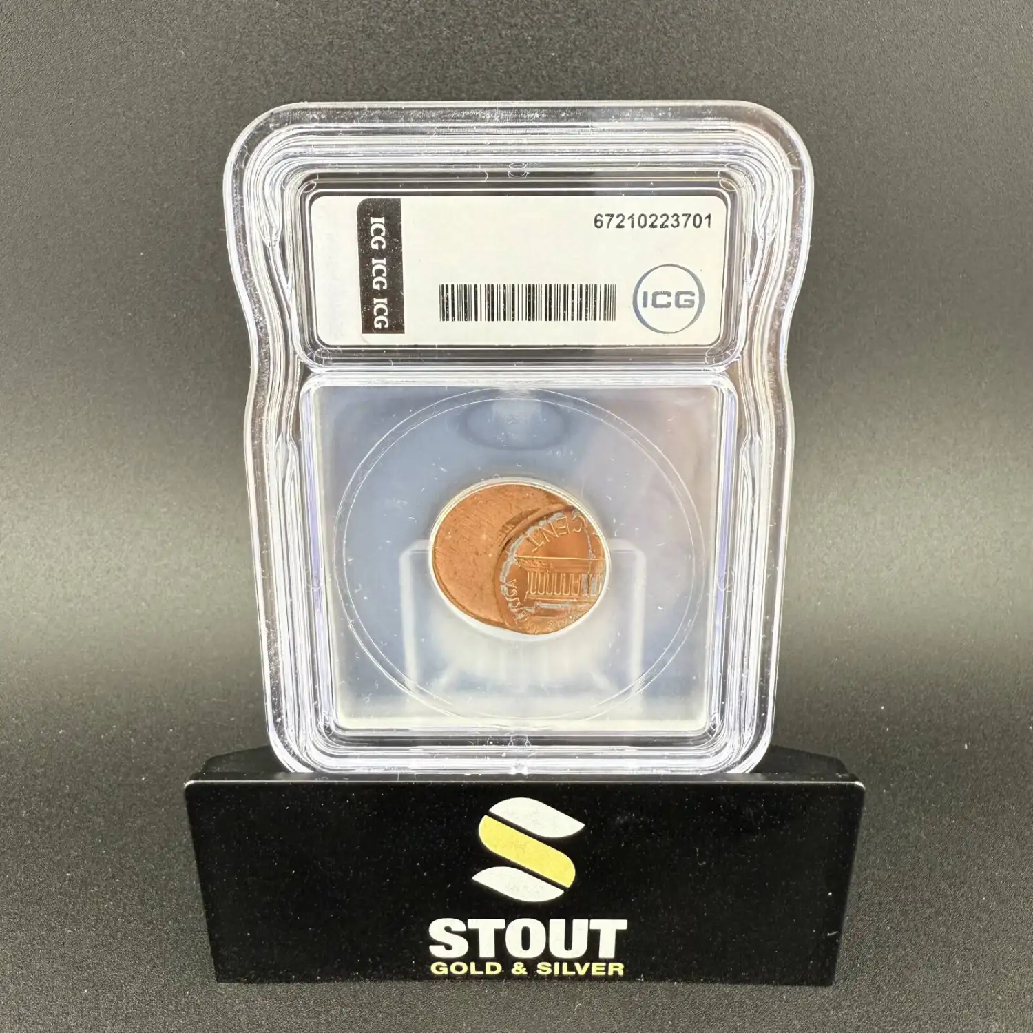 Graded by the Independent Coin Graders (ICG) as Mint State-65 Red (MS-65 RD), this Lincoln Wheat Penny boasts a vibrant, fully-red luster. The off-center strike, a highly sought-after error, adds an intriguing element to this already remarkable piece.