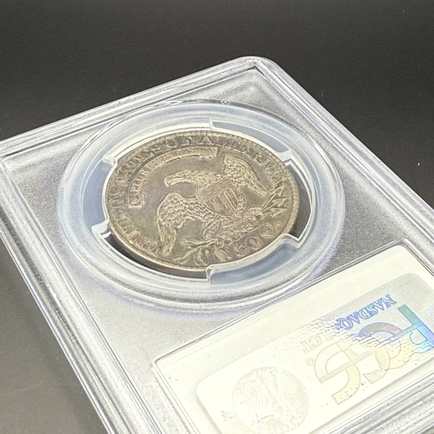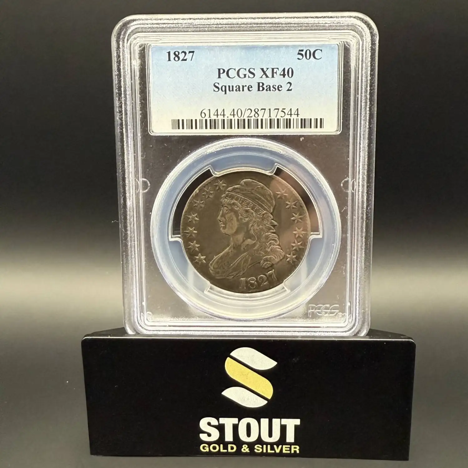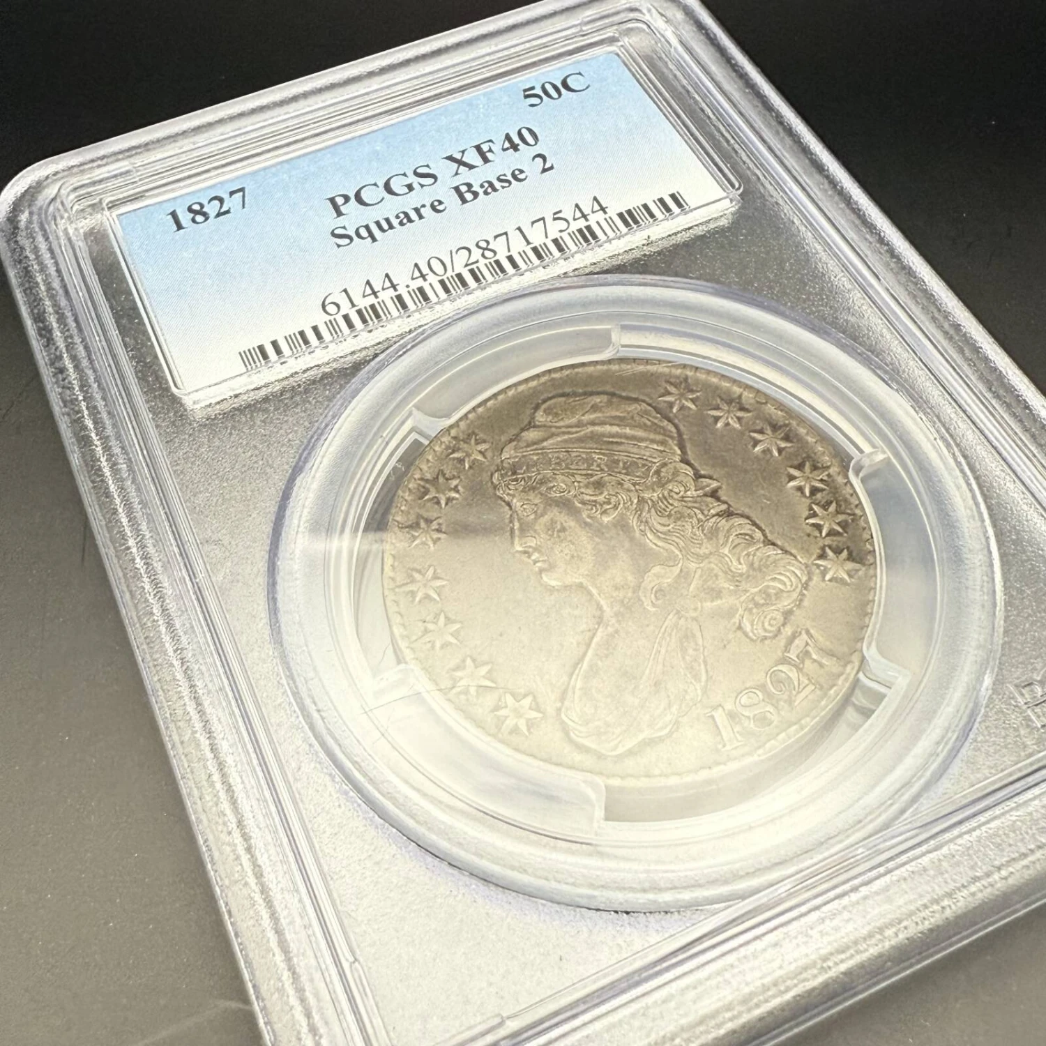 The Capped Bust half dollar was the primary silver coin denomination used in the United States for over three decades, playing a vital role in the country's economic development. The 1827 P Capped Bust Half Dollar PCGS XF-40 Square Base 2 is a valuable addition to any numismatic collection.