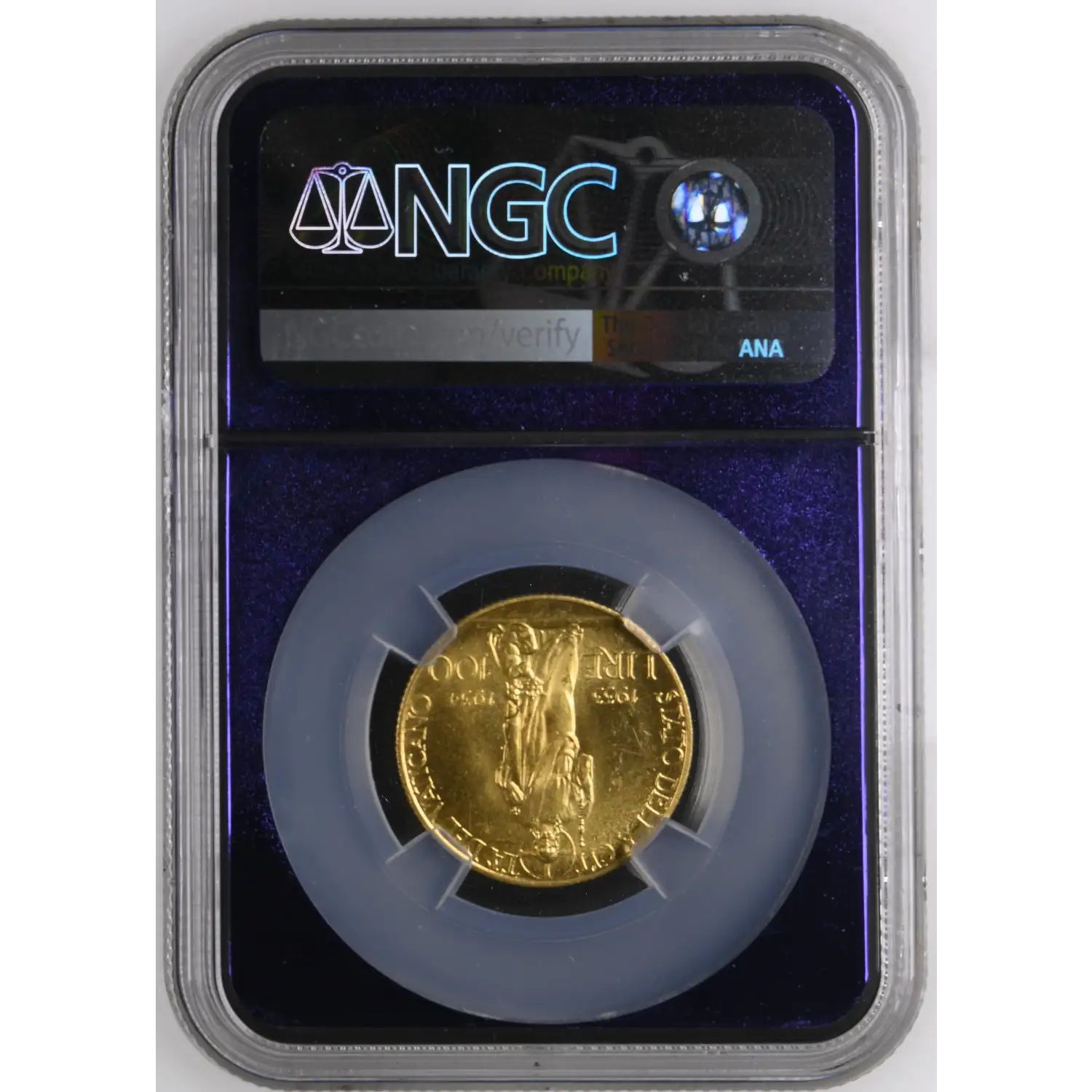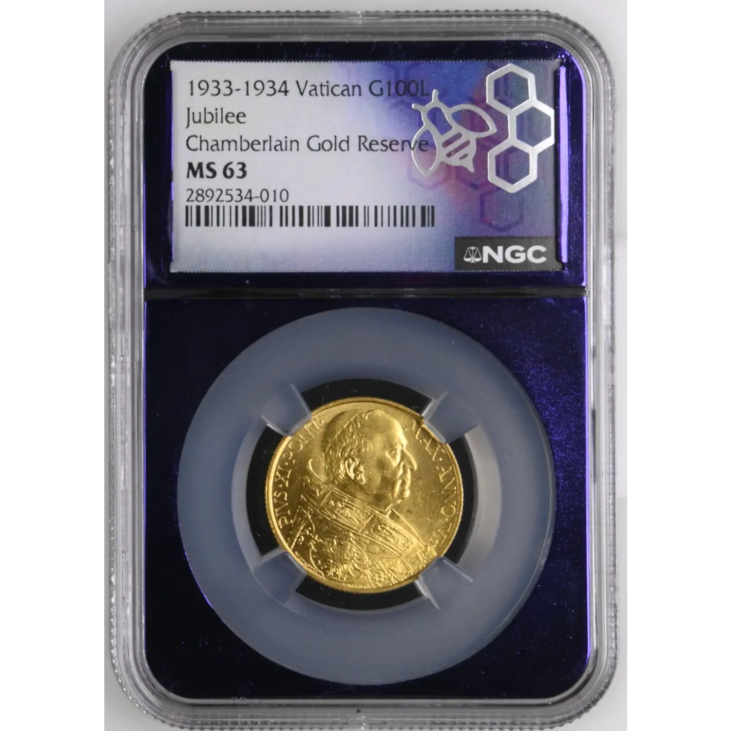 Discover the remarkable 1933-1934 Vatican City Gold 100 Lire Jubilee Coin, a stunning numismatic gem that offers a glimpse into the rich history and culture of the Vatican. Minted during the Jubilee year, this exquisite coin, graded by the prestigious NGC as Mint State 63, commemorates a significant event in the Vatican's history – the celebration of the Holy Year or Jubilee.