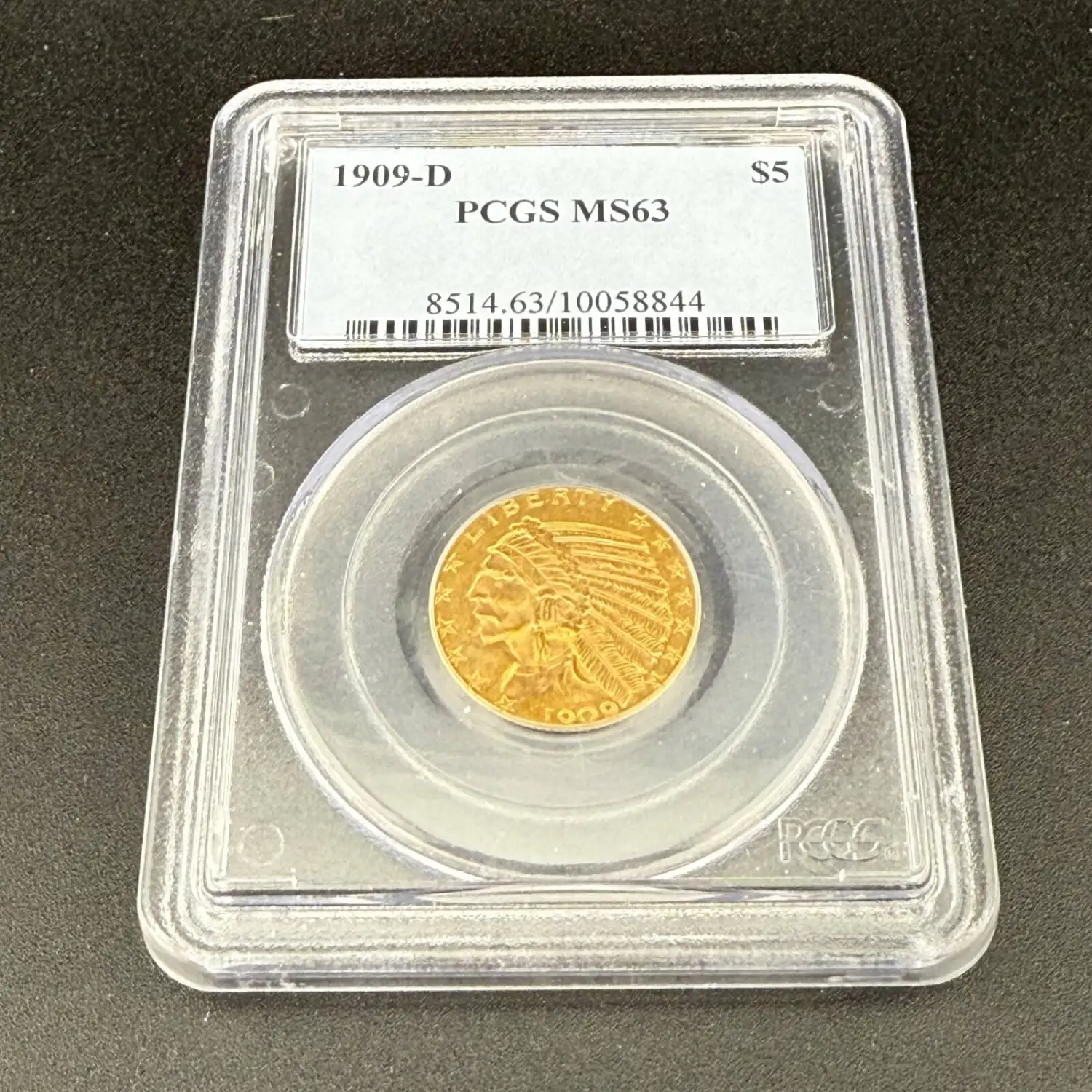 Introducing the captivating 1909 D $5 Indian Head Gold Coin, a stunning numismatic treasure from the United States. This exquisite PCGS MS-63 coin is a testament to the country's rich history and the artistry of its coinmakers.