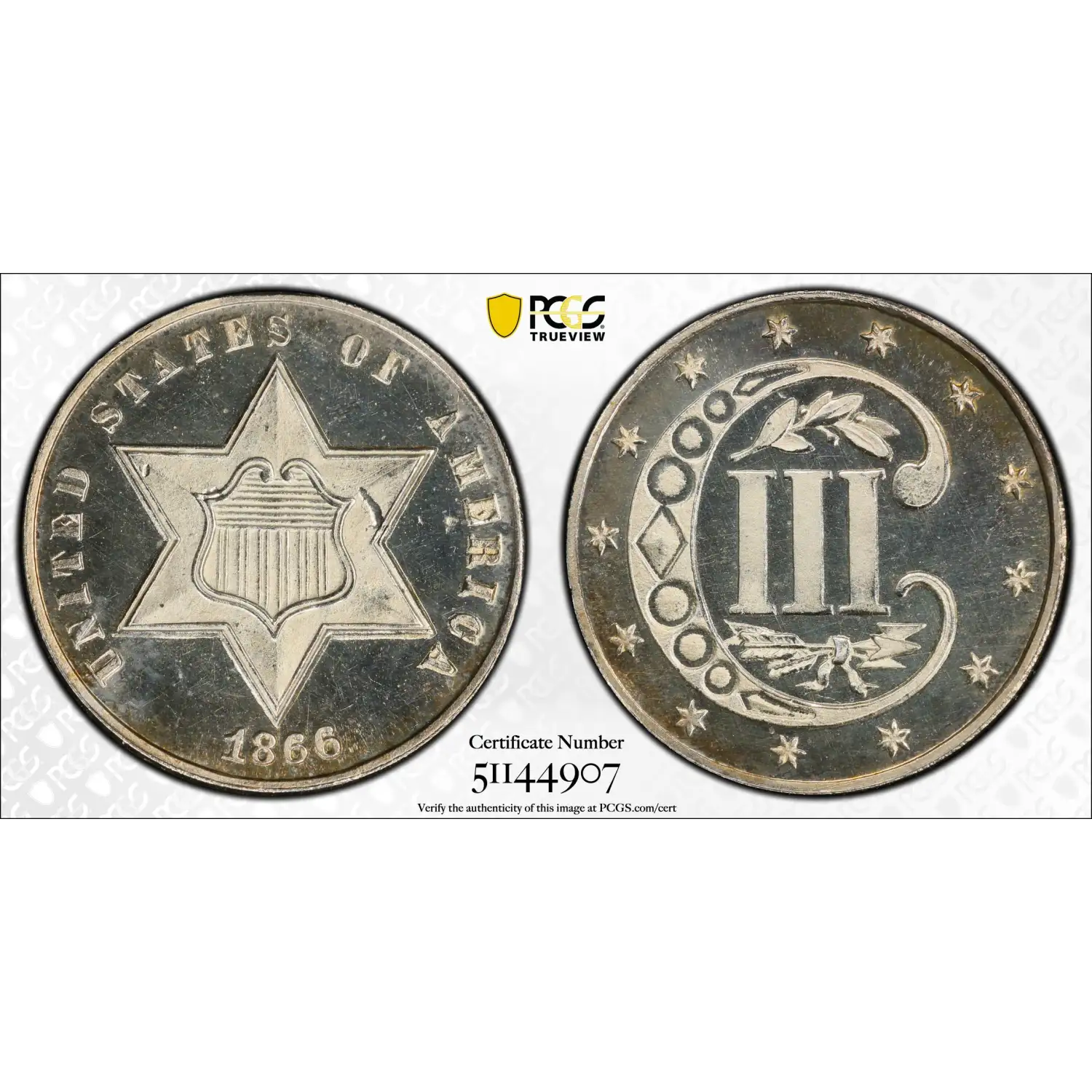 The Three Cent Piece, or "Trime," was introduced in 1851 to address the need for smaller denominations. The 1866 P Silver Trime stands out for its exceptional proof condition and stunning Deep Cameo finish, creating a mesmerizing visual effect.