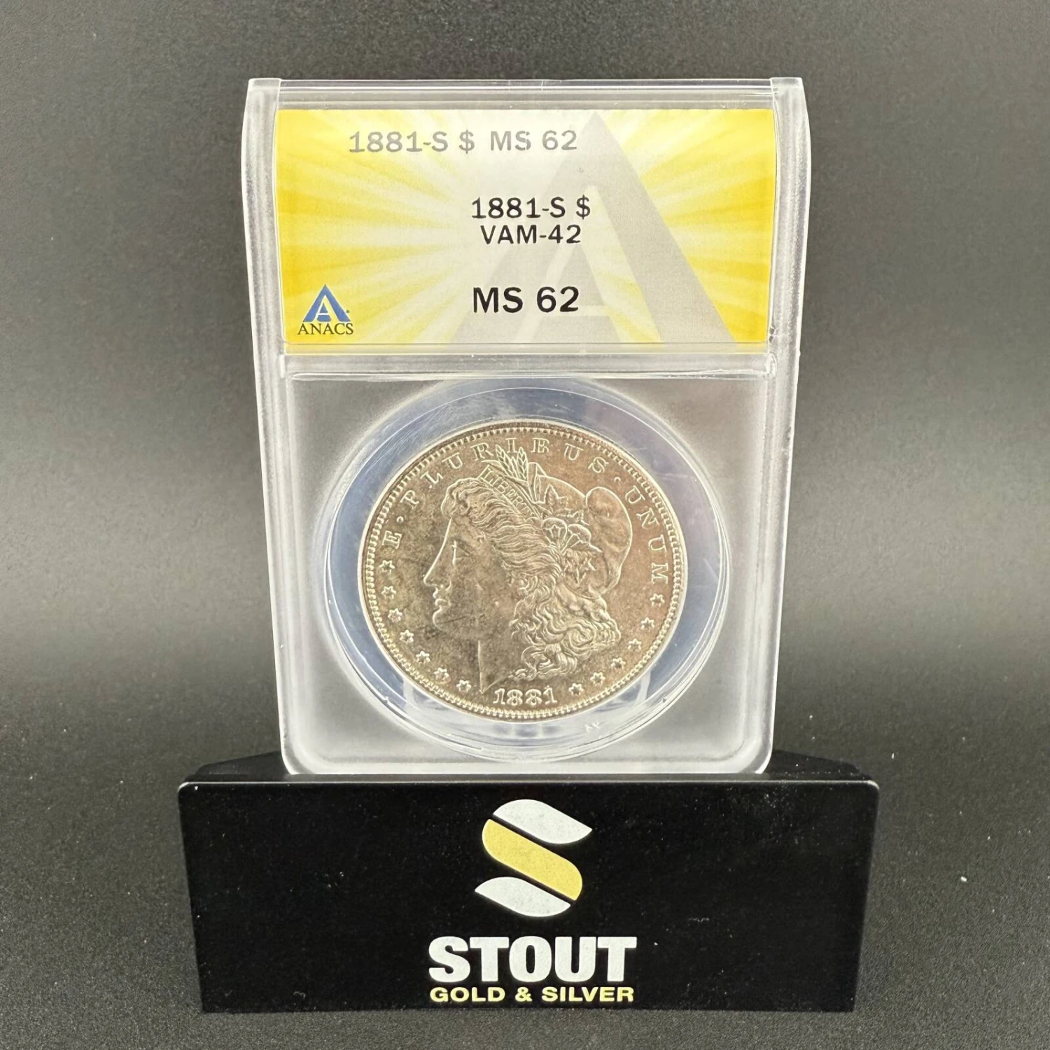 The unique "Raised R" VAM-42 variety adds rarity and collectibility. Graded MS-62 by ANACS, this 1881-S Morgan is a true gem, offering a piece of American numismatic history.