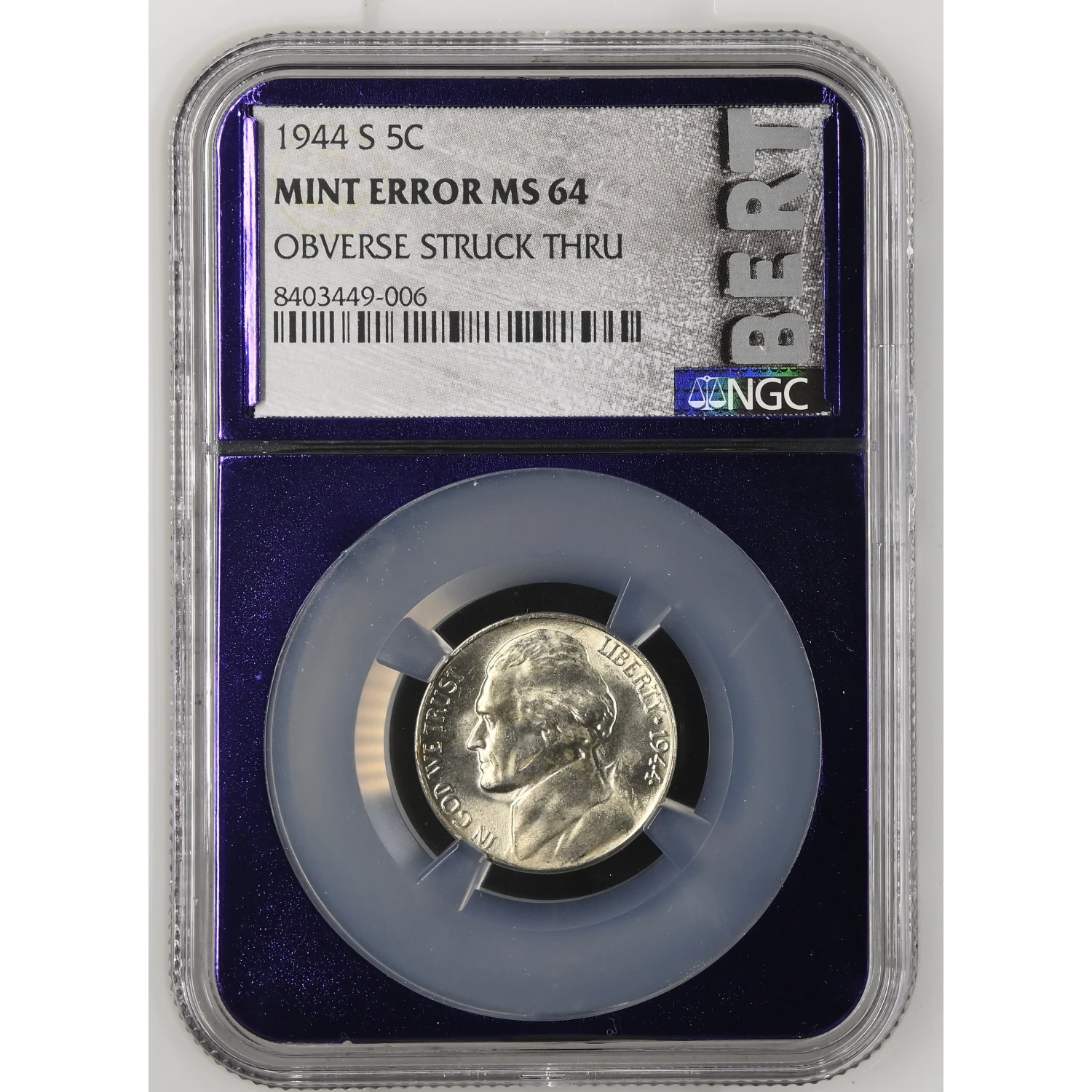 Struck at the San Francisco Mint, this 1944 Jefferson Nickel bears the coveted "S" mintmark, signifying its origin from the West Coast facility. The "Obverse Struck Through" error, a fascinating manufacturing anomaly, has rendered this piece truly one-of-a-kind.