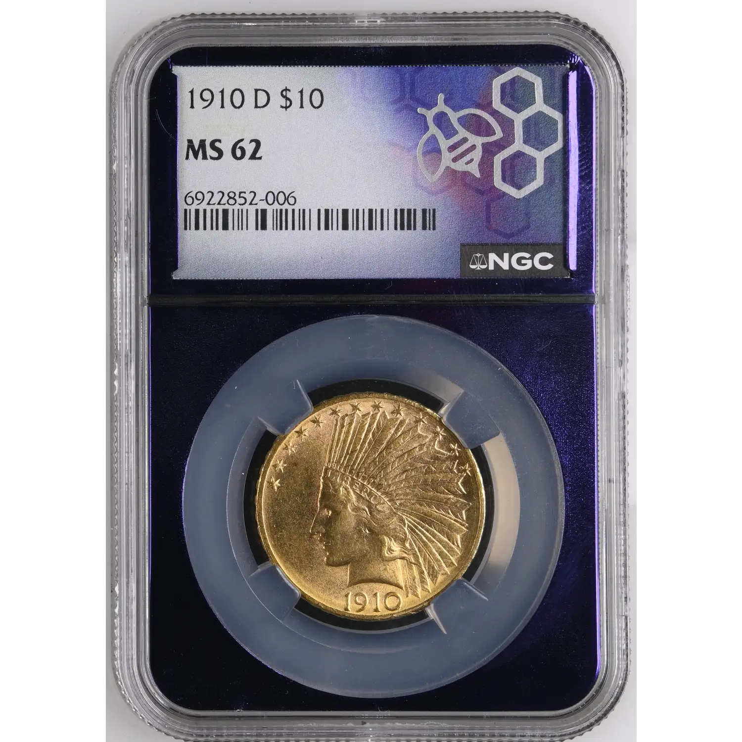 This 1910-D $10 Indian Gold Eagle has been certified MS-62 by NGC, one of the most respected and trusted coin grading authorities. A classic design and a popular date for collectors, this piece makes an excellent addition to any numismatic portfolio.