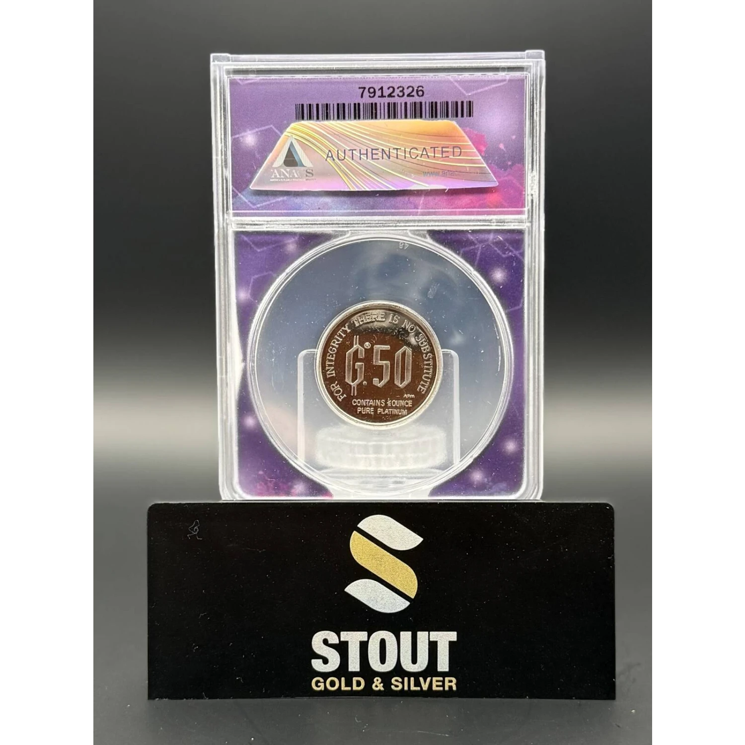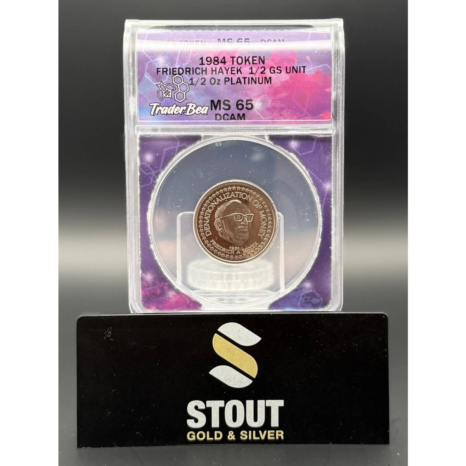 A truly unusual piece! Struck in 1/2 oz of pure platinum, it features a portrait of economist and philosopher Friedrich A. Hayek (1899–1992) on the obverse, dated 1983 and surrounded by the inscription “DENATIONALIZATION OF MONEY.” The reverse shows a $50.00 denomination along with the motto “FOR INTEGRITY THERE IS NO SUBSTITUTE.” A scarce and distinctive item!