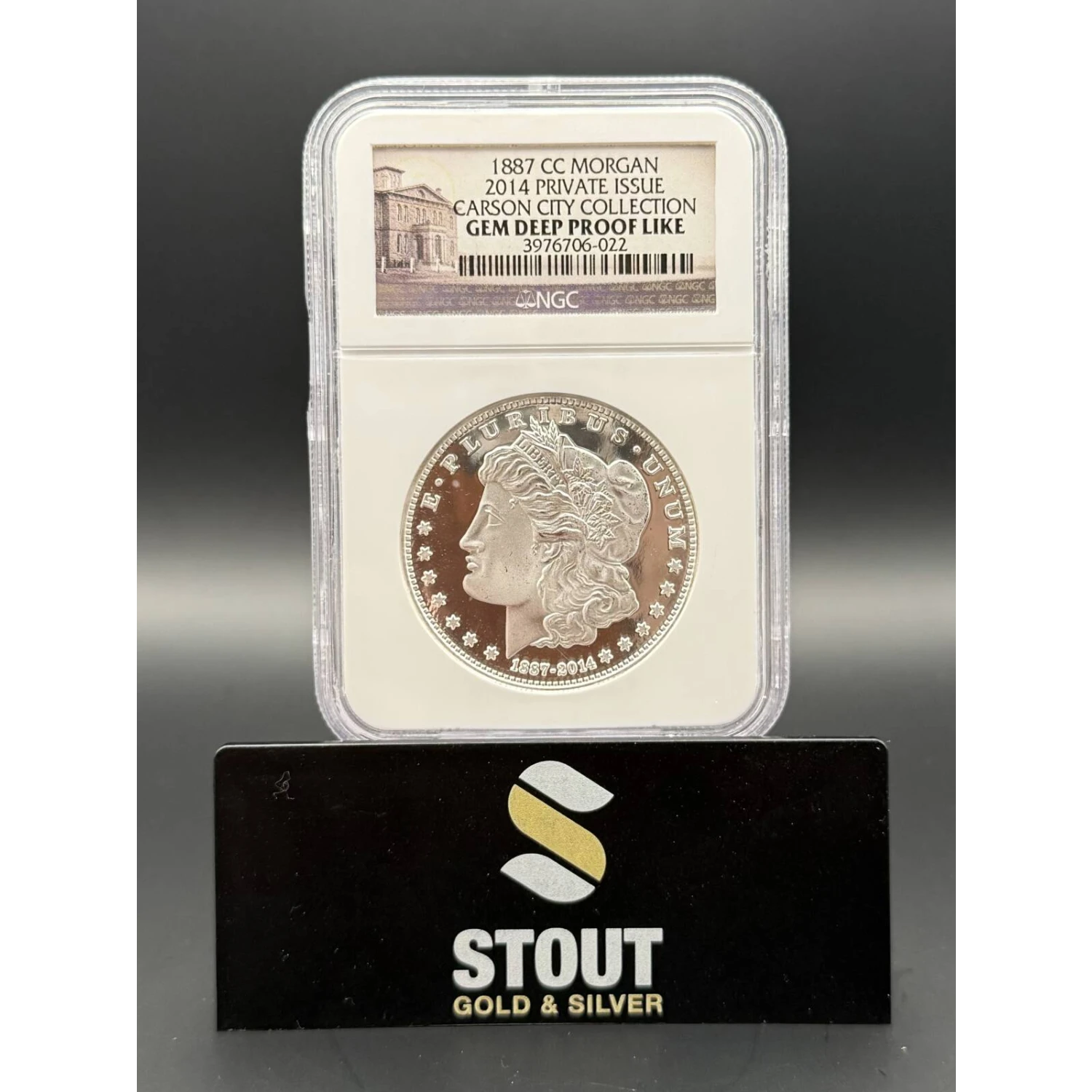This 1887-CC Modern Morgan Dollar is a GEM Deep Proof-Like example graded by NGC and part of a 2014 Private Issue from the Carson City Collection. Struck in silver with exceptional attention to detail, this modern release honors the historic Morgan design while showcasing deep reflective fields and sharply struck devices. Its Proof-Like surfaces and bold cameo contrast give it a striking presence, perfect for collectors seeking a premium modern tribute to a classic Carson City issue.