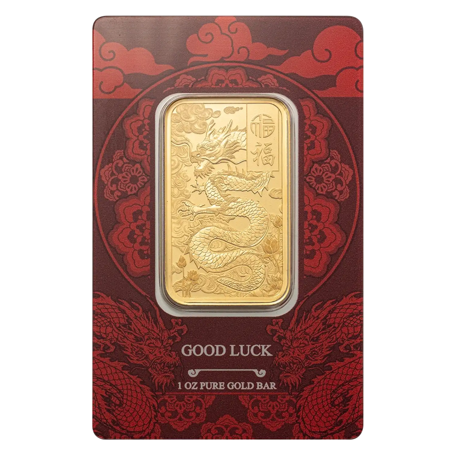 Produced from .9999 fine gold, the PAMP Good Luck Yellow Dragon bar features an intricately designed yellow dragon, a symbol of power, strength, and good luck. The meticulous engravings on the bar showcase the detailed craftsmanship that PAMP is renowned for, making it not only a solid investment but also a collector's item. Encased in a tamper-evident assay card, each bar comes with a unique serial number, ensuring authenticity and providing peace of mind to buyers.