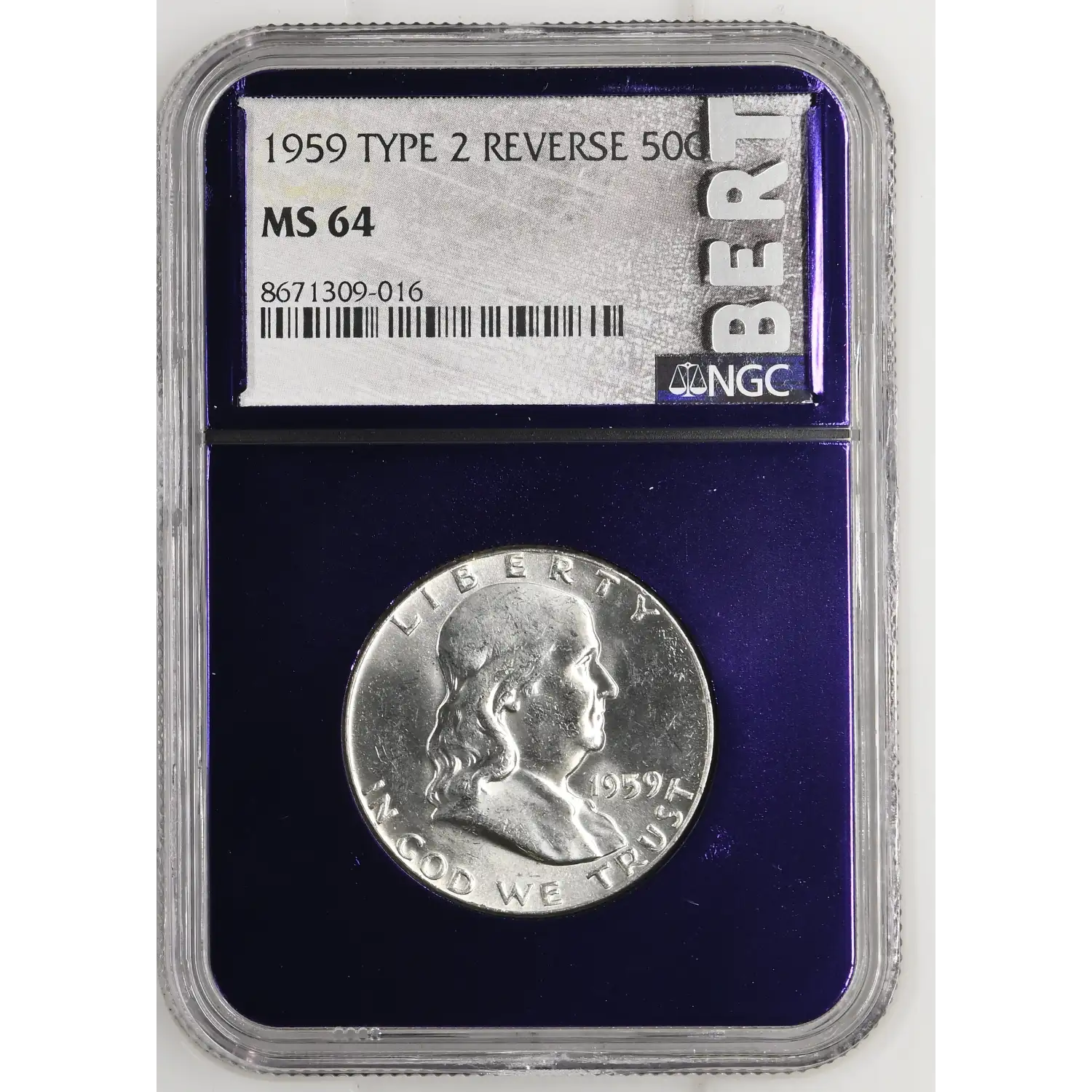 The 1959 Franklin Half Dollar is a beloved classic of mid-century American coinage, known for its timeless design and strong collector appeal. Graded MS-64 by NGC and featuring the desirable Type 2 reverse, this example is further enhanced by its presentation in a Trader Bea holder with the distinctive BERT label, adding a unique and collectible touch.