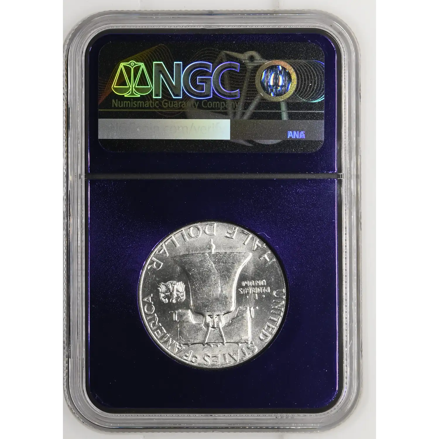 This 1959 Franklin Half Dollar combines near-Gem Mint State preservation with a desirable reverse type and eye-catching slab presentation, making it an excellent addition to any certified U.S. coin collection.