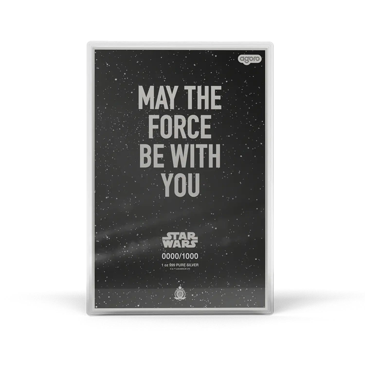The reverse features a heavy frosted finish and displays the Star Wars logo, the phrase “May the Force be with you,” and an individual serial number. The Public Seal of Niue appears on the back, confirming the foil as legal tender.
