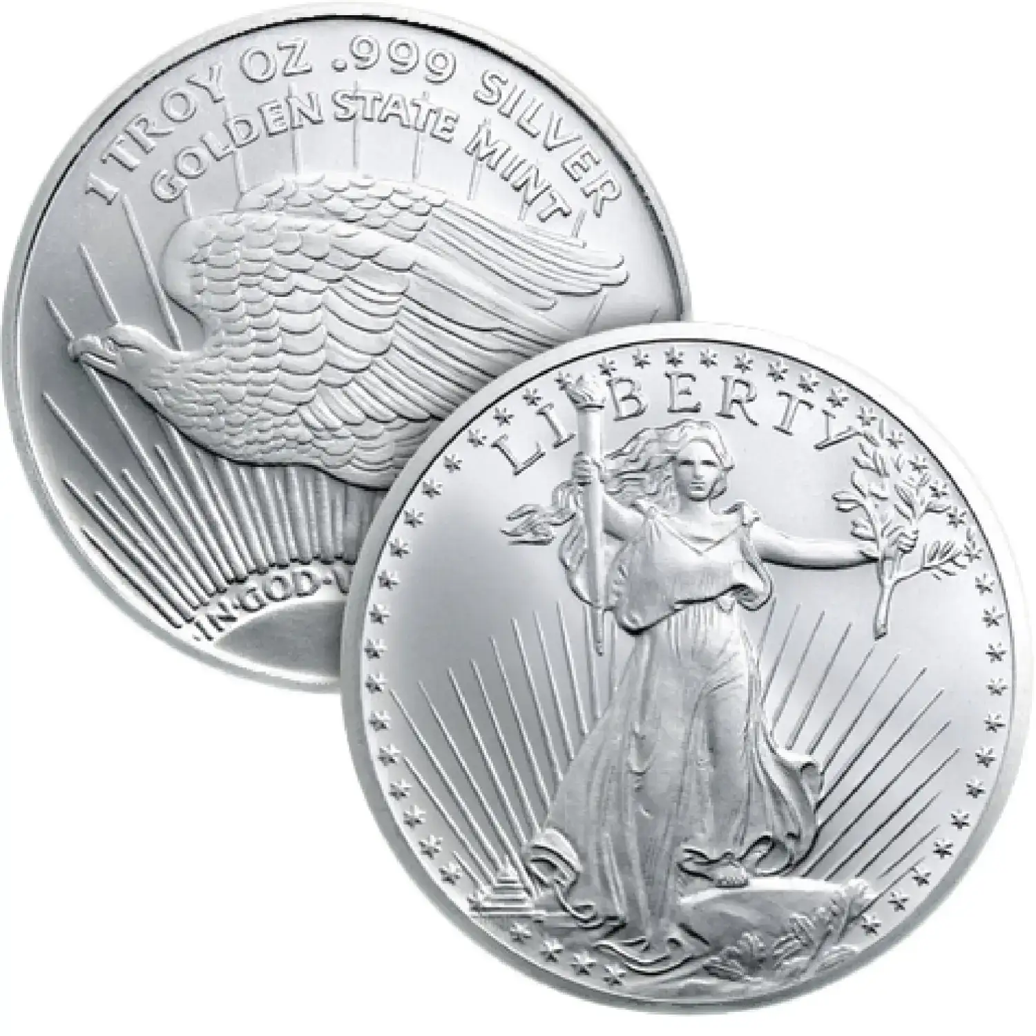 Struck in .999 fine silver, the Saint-Gaudens 1 oz Silver Round from Golden State Mint celebrates one of the most iconic designs in American coinage history. Inspired by Augustus Saint-Gaudens’ legendary Liberty design, this round captures the timeless beauty and symbolism that have made it a favorite among collectors and investors alike. The obverse features Lady Liberty striding forward with torch and olive branch in hand, set against radiant sun rays—an enduring image of freedom and progress. The reverse presents a bold, patriotic eagle motif along with clear inscriptions of weight and purity. Expertly minted by Golden State Mint, this silver round blends classic American artistry with modern bullion quality.