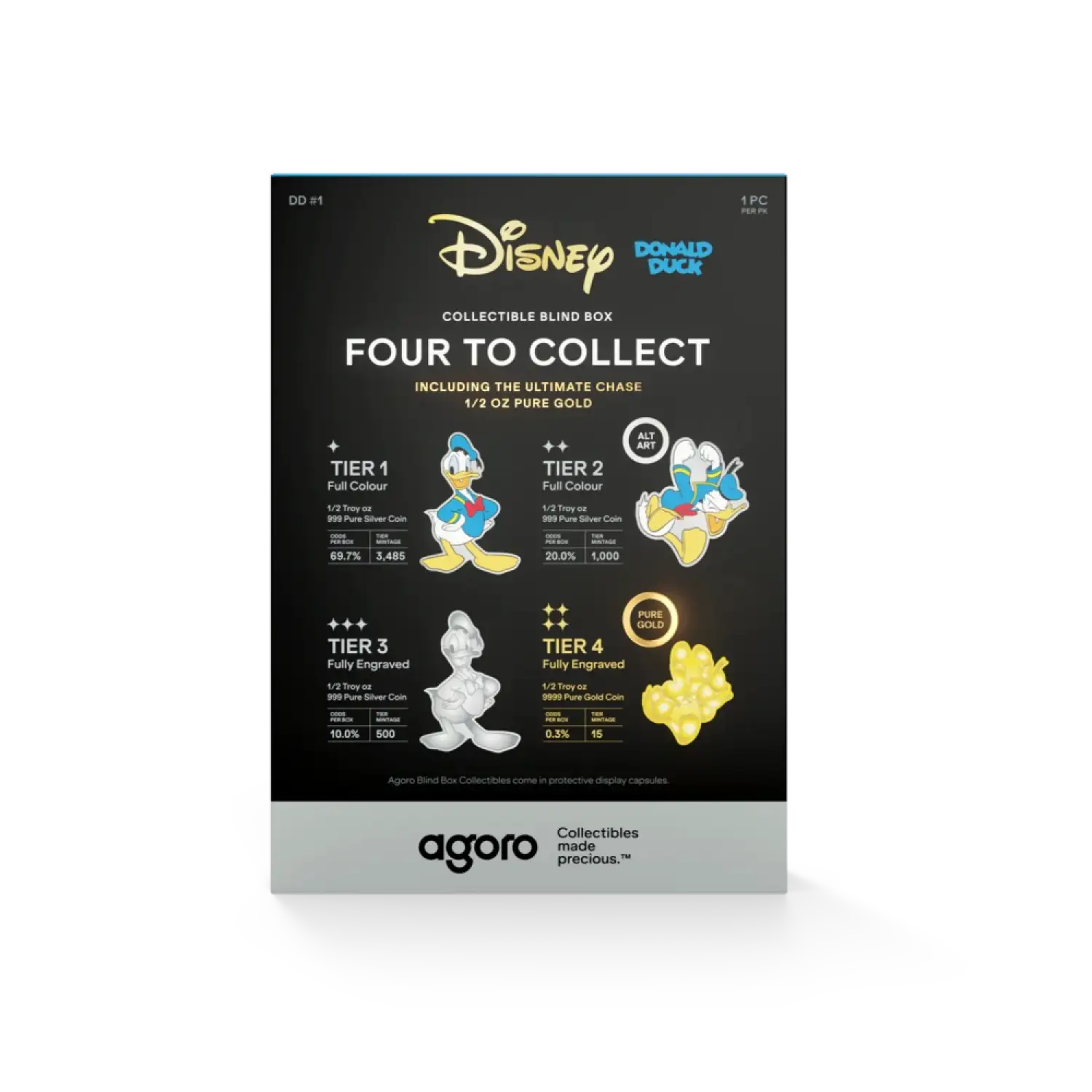 Each Agoro Donald Duck Blind Box reveals Disney’s famously fiery duck, struck in pure silver or pure gold.