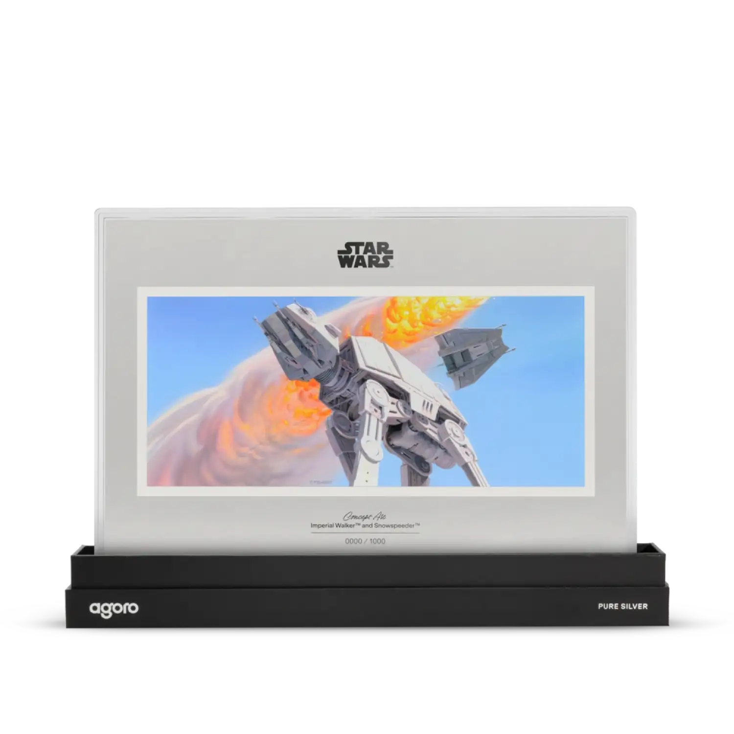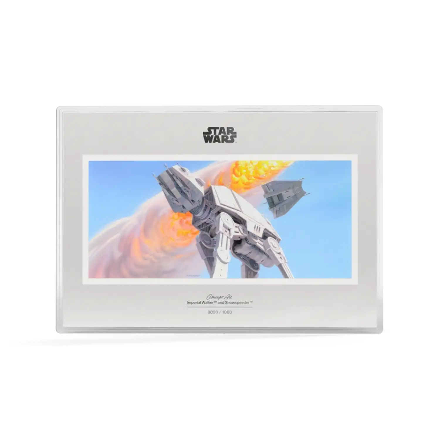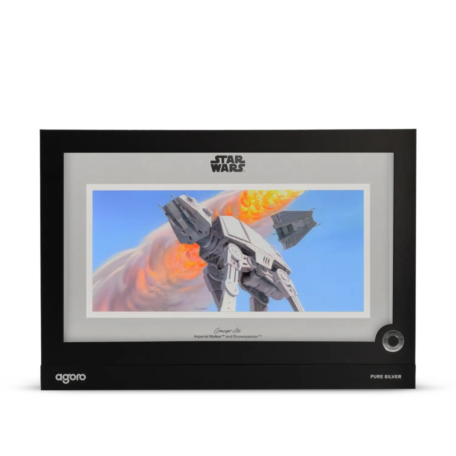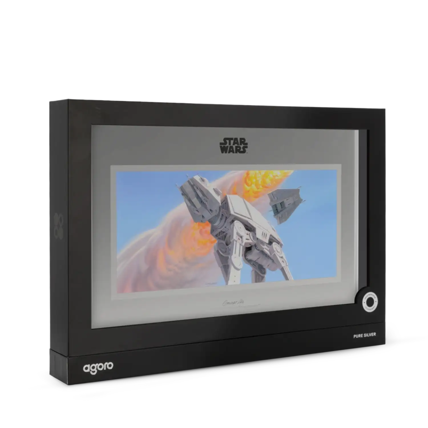 This 1 oz .999 pure silver collectible marks the second release in Agoro’s STAR WARS™ Concept Art Series, showcasing a powerful battlefield scene with an imposing AT-AT™ advancing forward as a Snowspeeder™ streaks past a fiery explosion. STAR WARS™ concept art has always been more than preliminary sketches—it forms the creative backbone of the galaxy itself. These early works established the tone, scale, and imagination of a universe that would redefine modern cinema, and this series honors that foundational artistry.