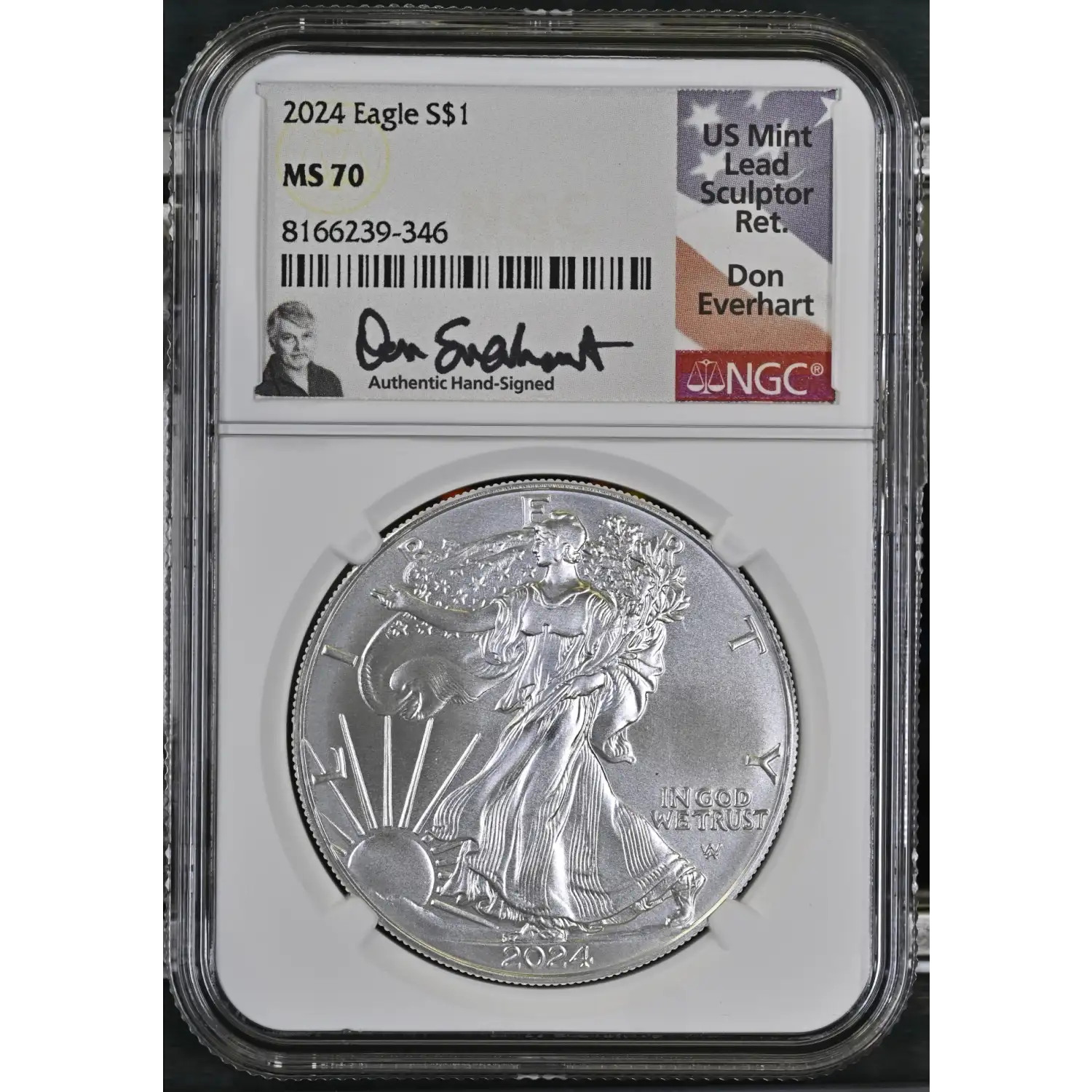 This 2024 American Silver Eagle contains 1 oz of .999 fine silver and has been graded a perfect MS-70 by NGC. Featuring the iconic Walking Liberty design and the modern eagle reverse, this example is enhanced with a Don Everhart signature label, honoring the former U.S. Mint Chief Engraver. A flawless grade combined with a sought-after signature makes this coin a standout addition to any Silver Eagle collection.