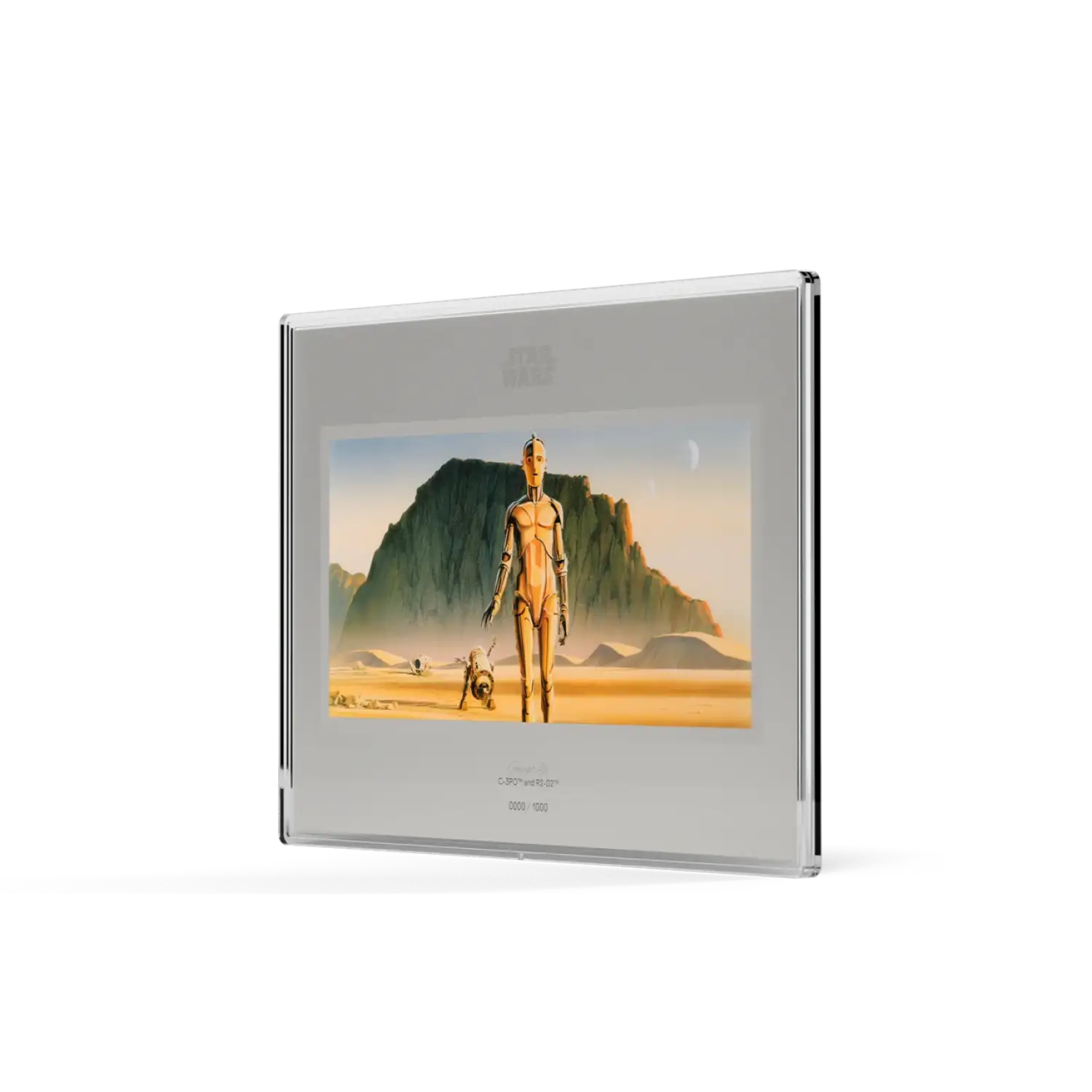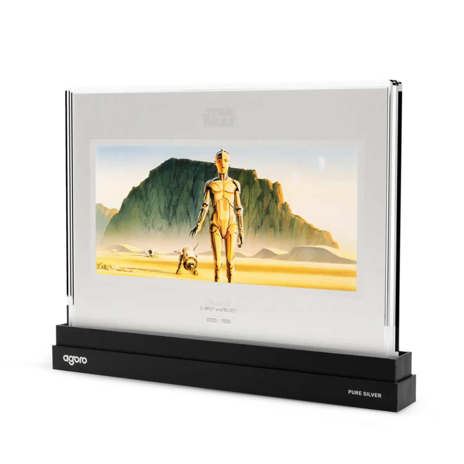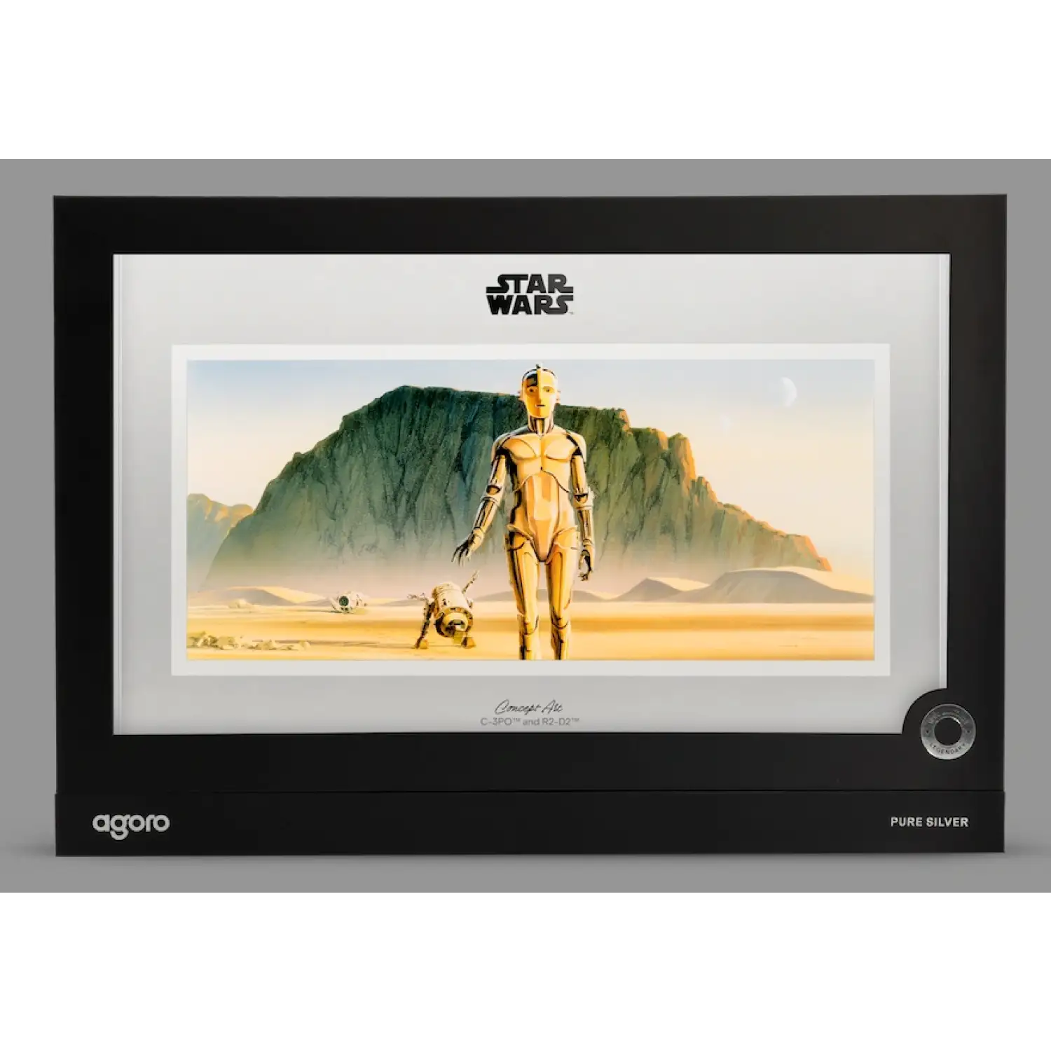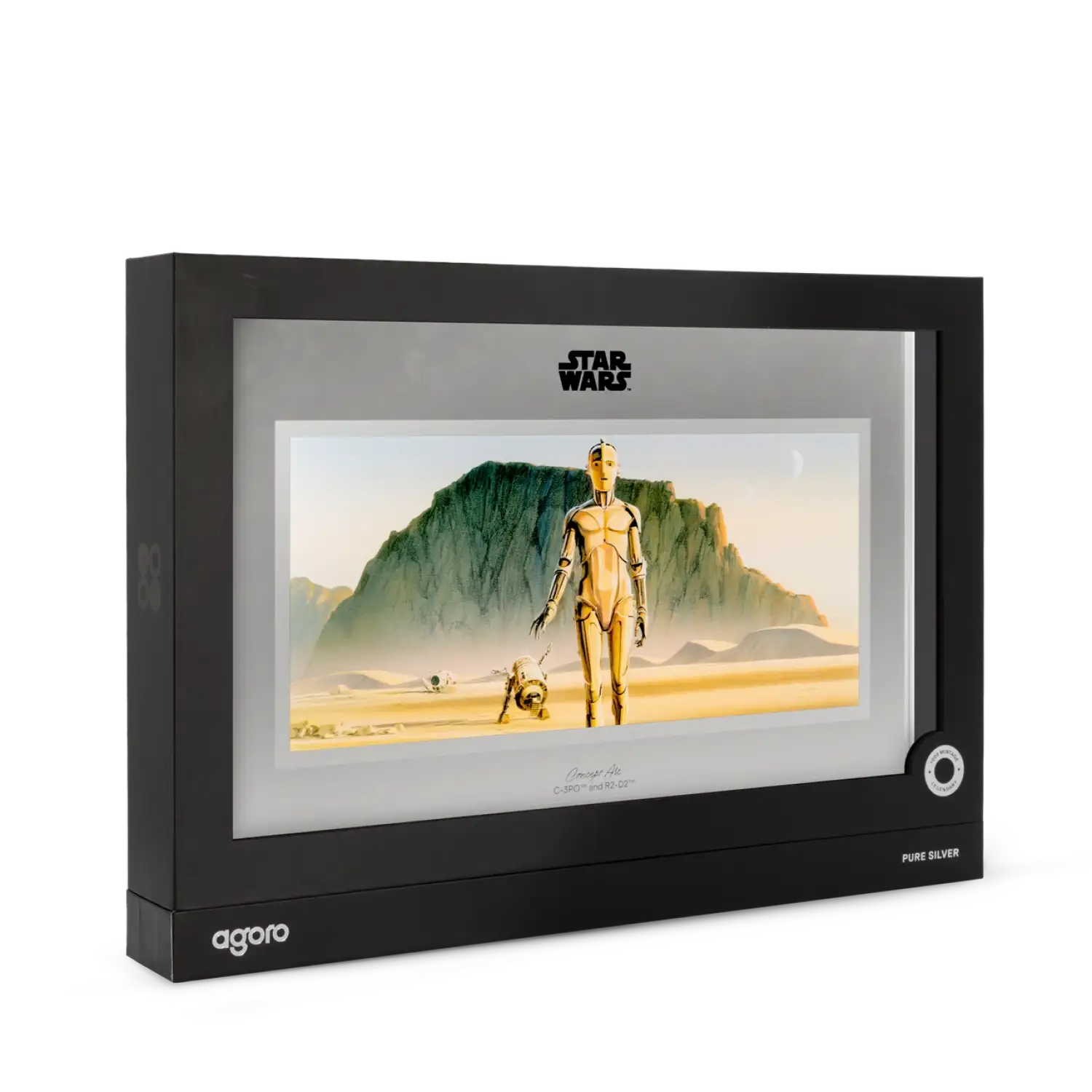 This 1 oz .999 fine silver collectible marks the third release in Agoro’s Star Wars™ Concept Art Series, showcasing C-3PO™ and R2-D2™ traveling across an expansive desert scene. Designed in a cinematic, poster-style layout, this silver foil brings to life the original concept artwork that helped define the Star Wars universe. The piece combines a hand-drawn, sketch-like aesthetic with frosted silver finishes and a sleek metallic border for added depth and contrast.