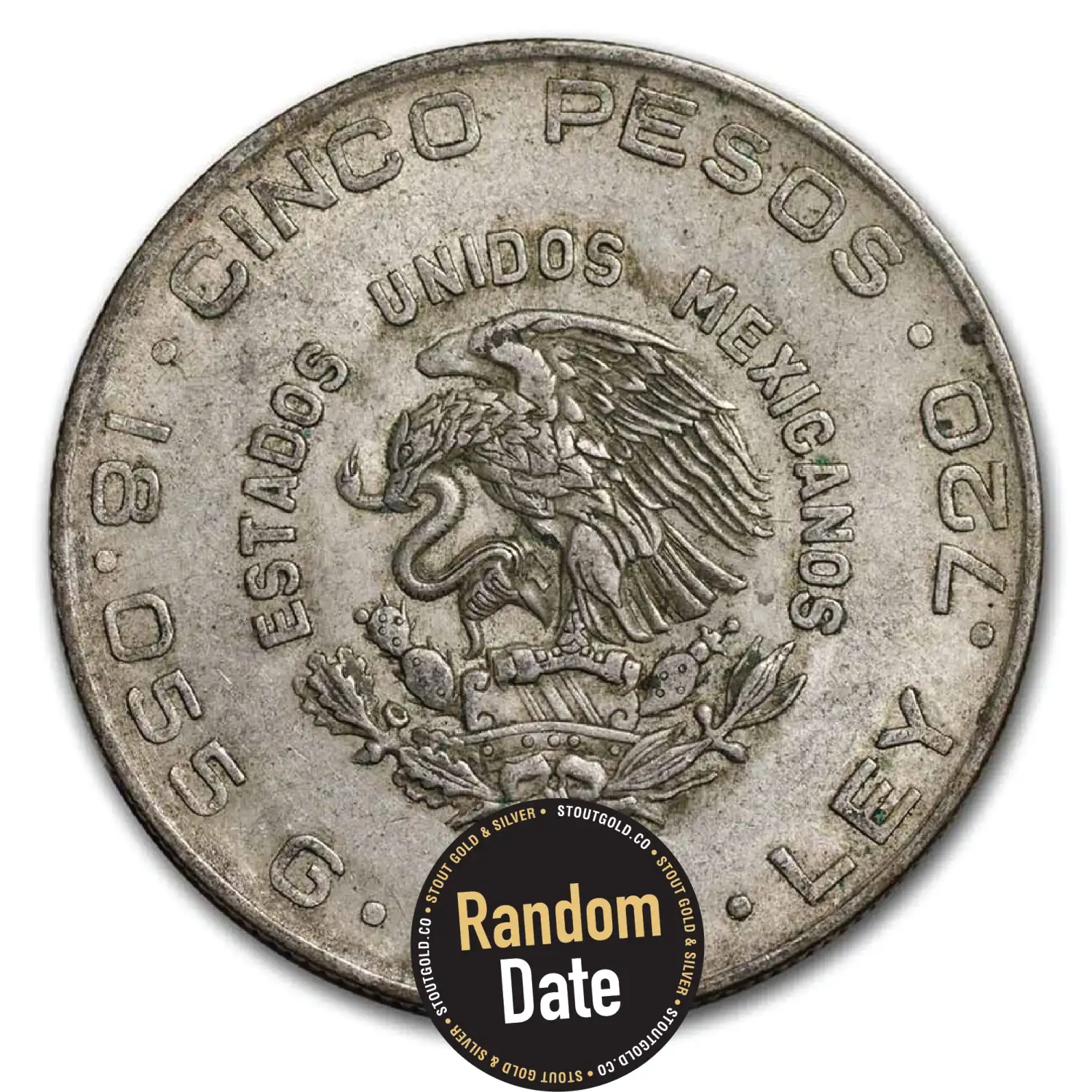 Obverse: Features the Mexican coat of arms, encircled by inscriptions denoting weight, purity, year, and denomination.
