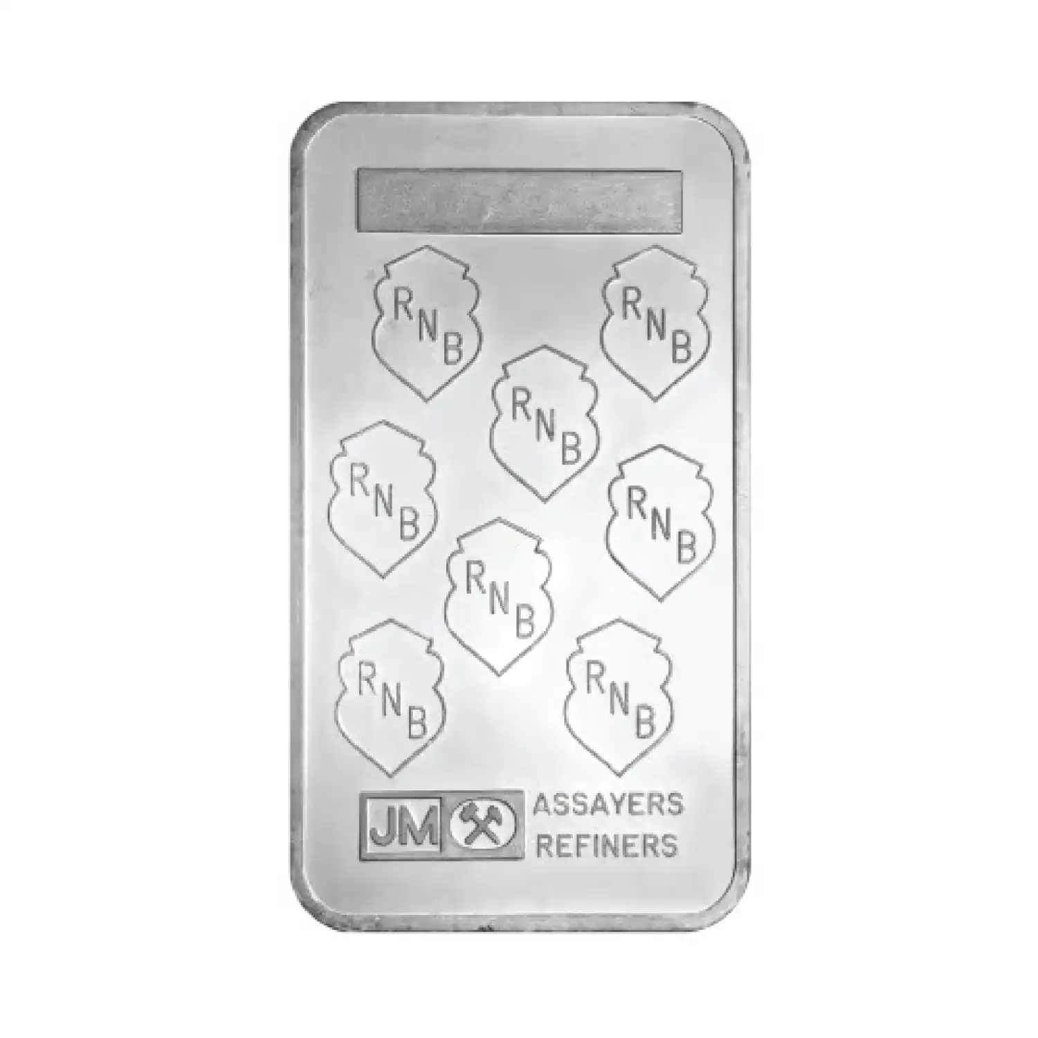 Reverse: Showcases a repeating diagonal RNB logo pattern, along with a unique serial number above and the Johnson Matthey hallmark below