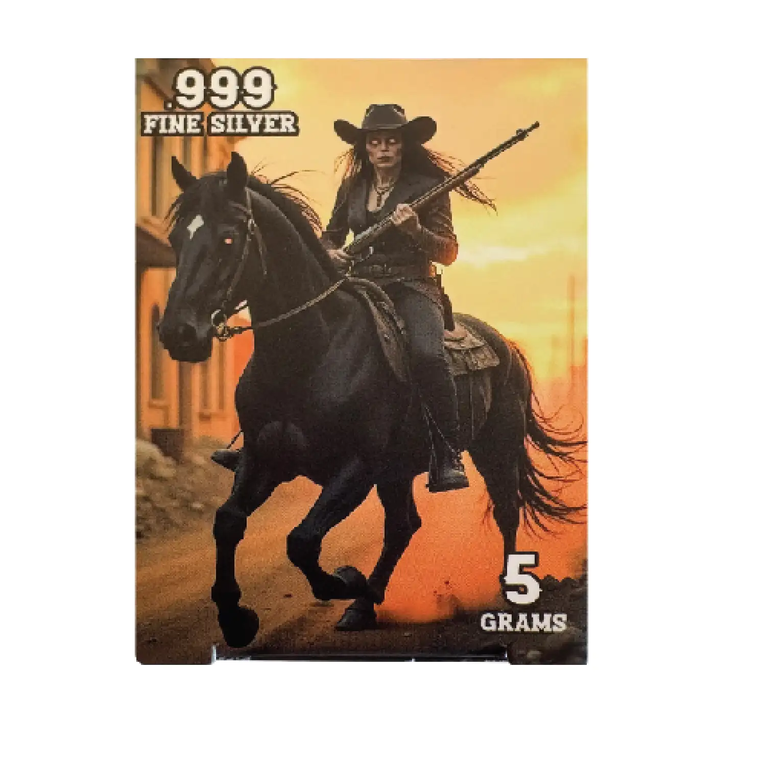 Ride into the frontier with this 5-gram .999 fine silver Skeleton Cowgirl—a striking mix of Western spirit and bold design. Featuring intricate detail and a brilliant proof-like finish, this piece captures a fearless cowgirl with unmistakable attitude.