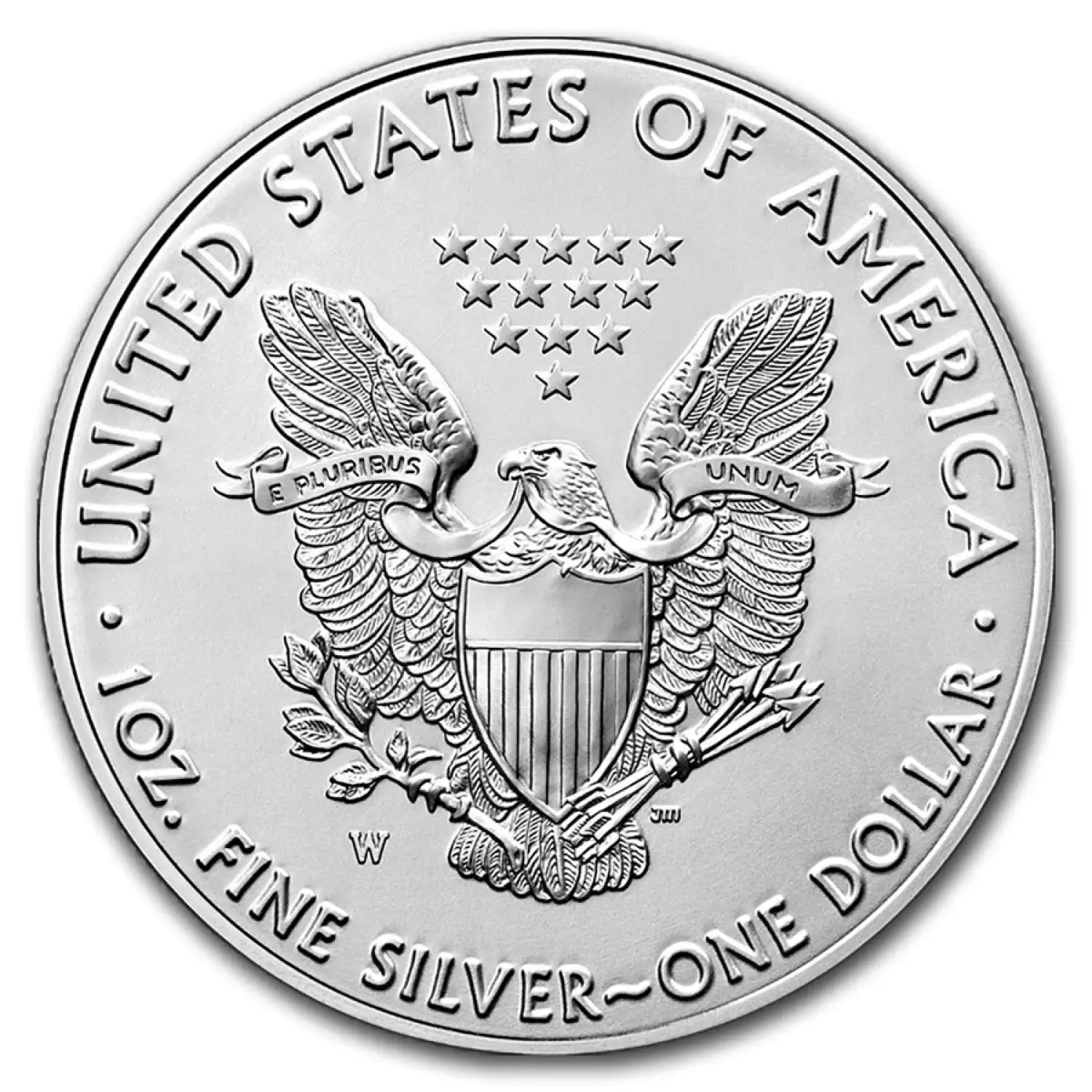These uncirculated Silver American Eagles bear the “W” mint mark and are struck on specially burnished planchets at the West Point Mint.