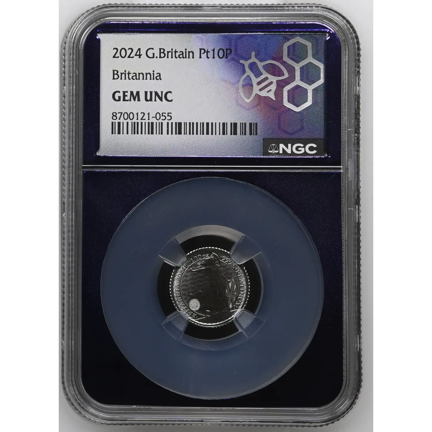 The 2024 1/10 oz Platinum Britannia offers the renowned beauty and security features of the Britannia series in a fractional size, making it an उत्कृष्ट choice for both collectors and investors. Graded Gem Uncirculated by NGC, this coin displays strong detail and exceptional eye appeal.
