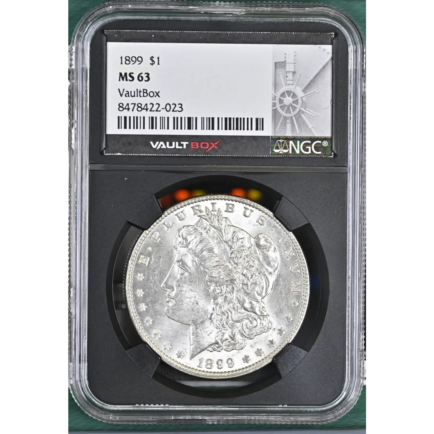 The 1899 Morgan Silver Dollar is a classic issue from the later years of the Morgan series, valued for its historic significance and enduring design. Struck at the turn of the century, these coins represent a pivotal era in American coinage. This example has been certified Mint State 63 by NGC, offering attractive luster with moderate contact marks typical for the grade. Encased in the sleek Vault Box Black Core slab, it provides both premium protection and modern presentation.