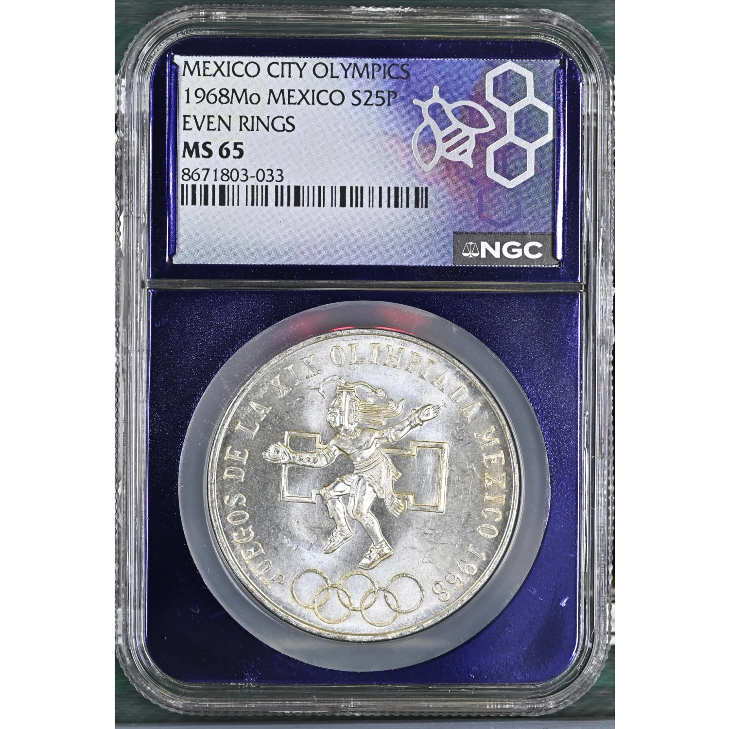 With its Olympic historical significance, certified Mint State 65 grade, and unique toned “Even Rings” designation, this 1968 Mexico 25 Pesos coin is a standout addition to any world silver collection.